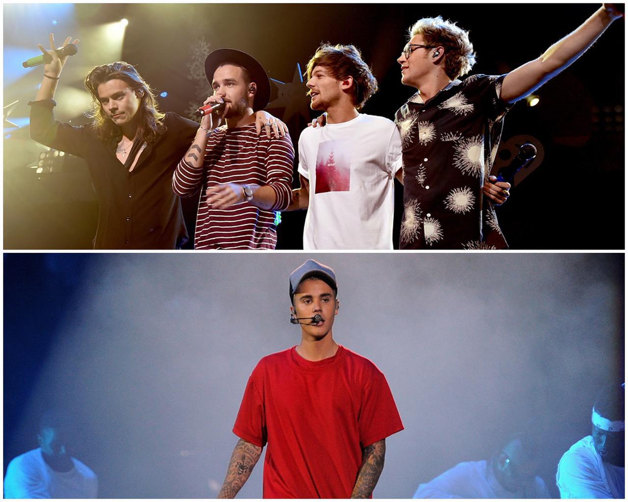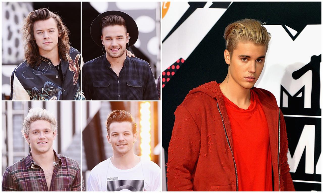 ワン・ダイレクションのメンバー(左上から時計回りにハリー・スタイルズ、リアム・ペイン、ルイ・トムリンソン、ナイル・ホーラン)とジャスティン(写真右)。