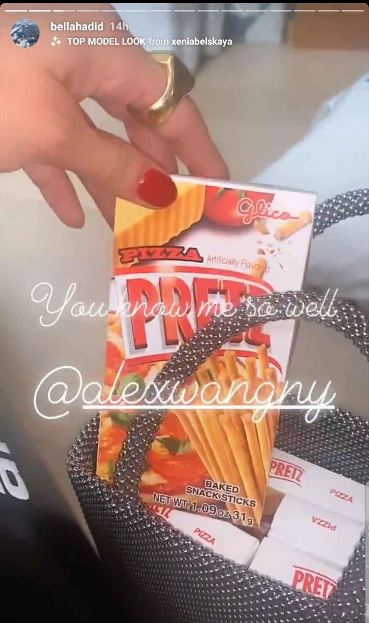 お菓子やピザといった高カロリーなものが大好物なベラが、今回自身のインスタグラムにある写真をアップ。そこには、デザイナーで友人のアレキサンダー・ワン(Alexander Wang)からもらったバッグのなかに、日本でも人気を博すグリコから販売されているプリッツの数々が。
