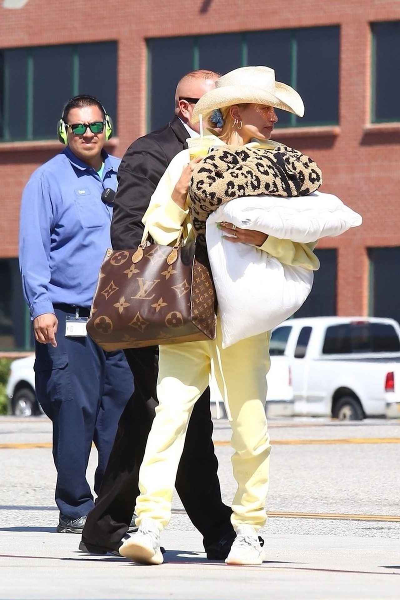 旅行に出かけるため、プライベートジェットに乗り込む前のヘイリーは、ルイ・ヴィトンのモノグラムの定番カラーであるブラウンを愛用。
