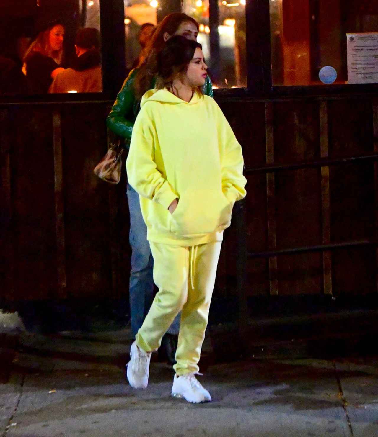仕事を終えてから友人のバンドのライブに駆けつけたセレーナは、メンズに人気のブランド、フィア・オブ・ゴッド(Fear of God)のイエローのスウェット素材のセットアップでリラックスムード。足元はお気に入りのプーマ(Puma)の白スニーカー「セル・ステラ―」。