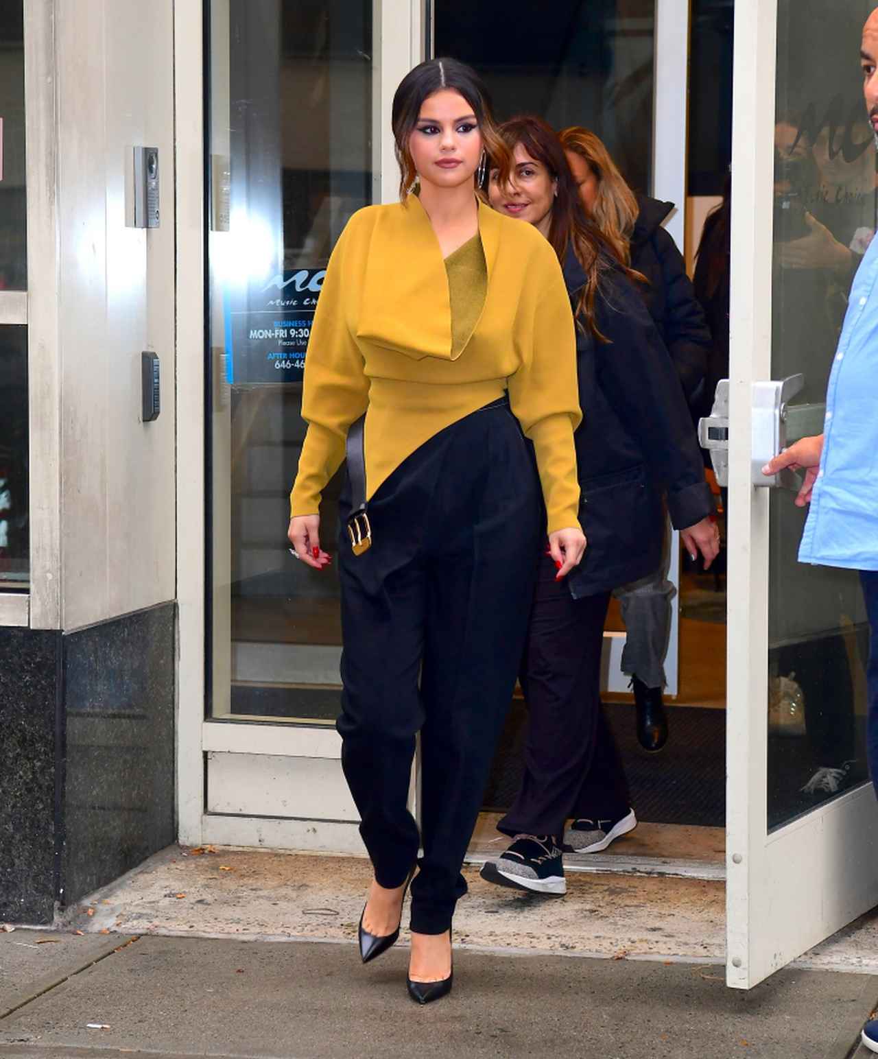 アシンメトリーな裾にベルトのデザインがあしらわれたカウルネックのプロエンザ・スクーラー(Proenza Schouler)のマスタードイエローのニットは存在感抜群の一着。同ブランドのブラックのパンツとサン・ローラン(Saint Laurent)の黒ピンヒールでシックにまとめて。