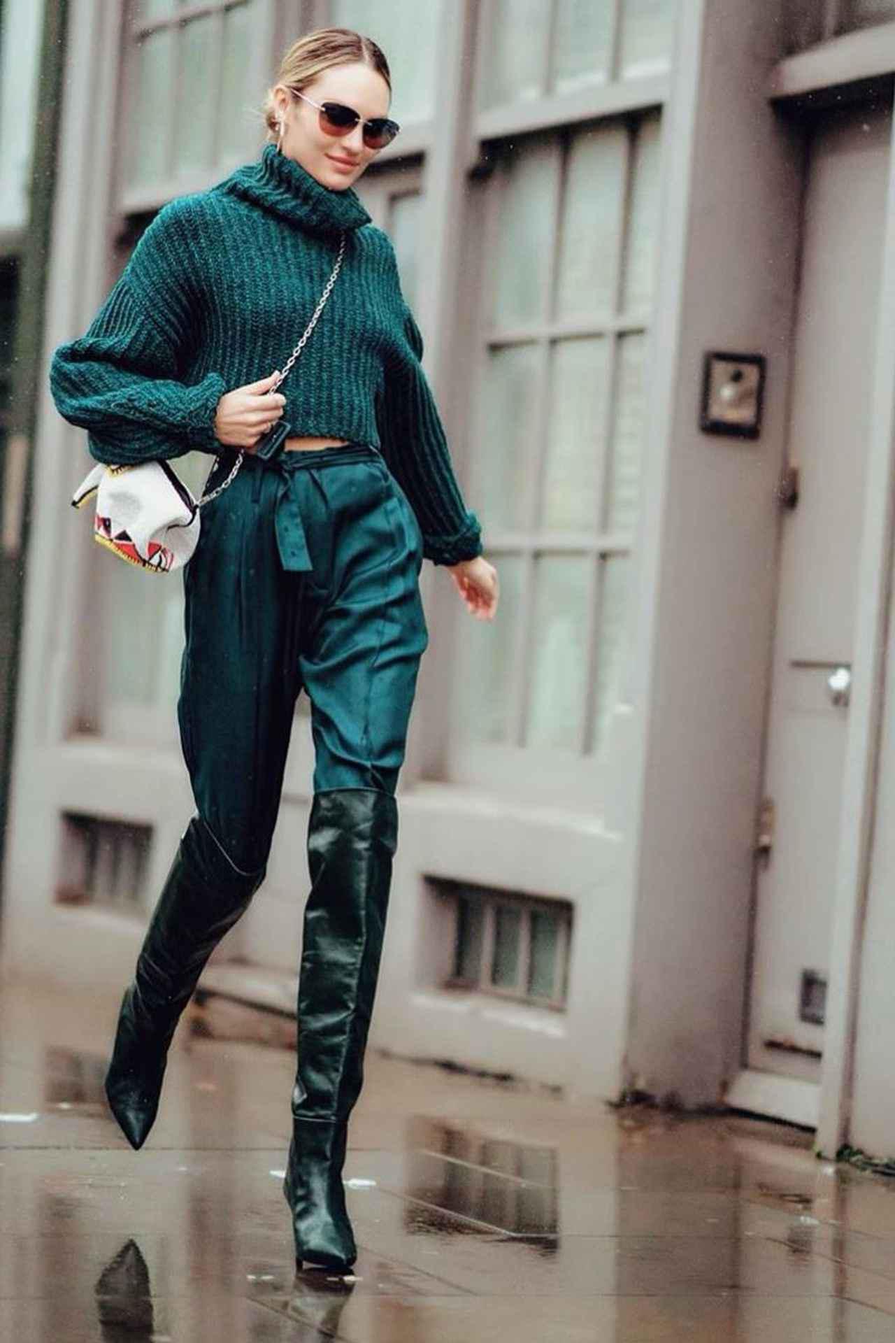トップモデルのキャンディス・スワンポールは、グリーンのニットとパンツのコーデに、カラーを統一したニーハーブーツを合わせ、オールグリーンコーデを完成。シックなコーデを、アニマルモチーフのバッグでポップに外したセレブらしいスタイリングに。