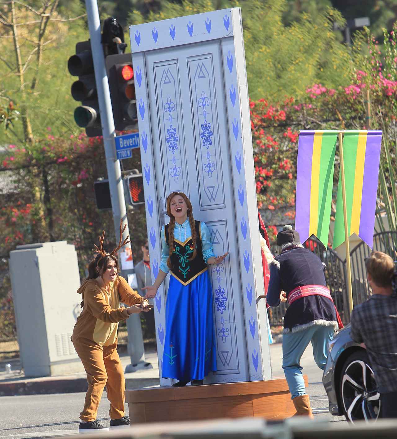 「横断歩道ミュージカル」では、イディナはクリストフの相棒であるトナカイのスヴェンのような衣装、クリステンは声優を務めたアナに変身。またイディナは2役を務めたのか、自身が声優を担当したエルサの姿でも登場している。