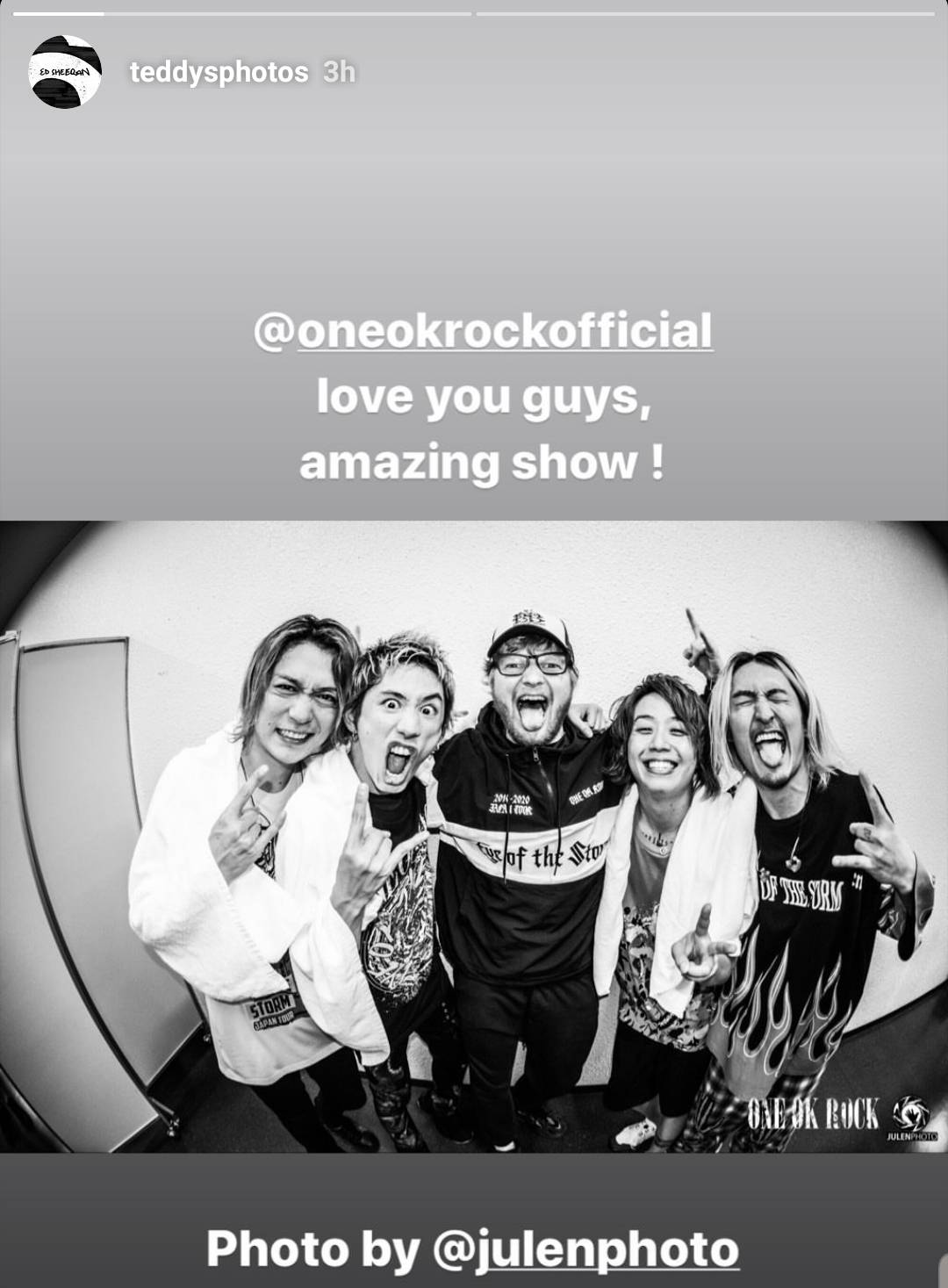 1枚目には、ワンオクのメンバー全員とエドとのグループショット。そこには、「ワンオクロック、愛しているよ、素晴らしいショーだった!」とのコメントが。