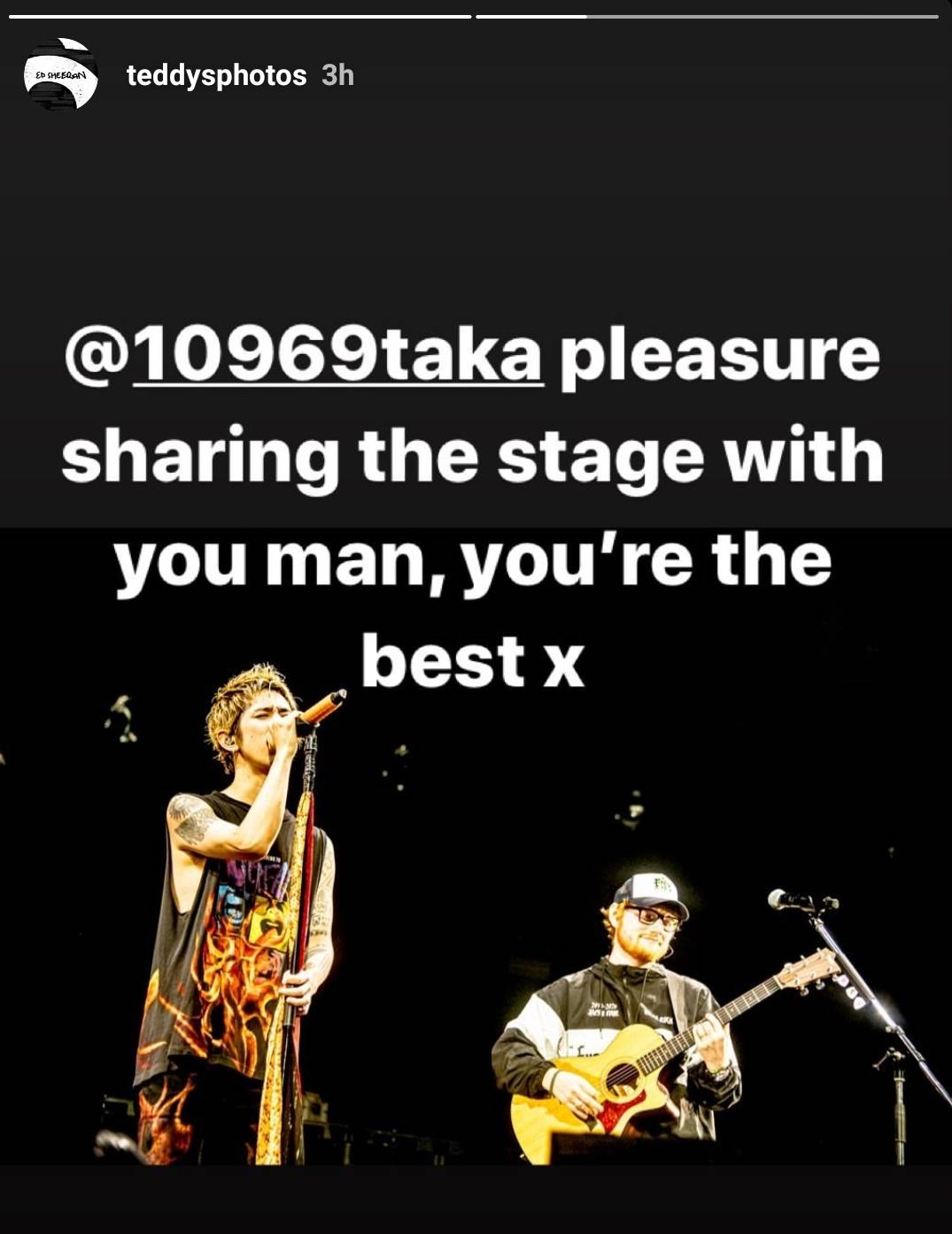 さらに、2枚目のタカとエドのステージ上での2ショット写真に添えたメッセージで、「タカ、君と一緒にステージに立つことが出来て嬉しかったよ。君は最高だ」とタカのことをベタ褒めし、3,200万人以上いるエドのインスタグラムのフォロワーにタカとの思い出をシェアした。