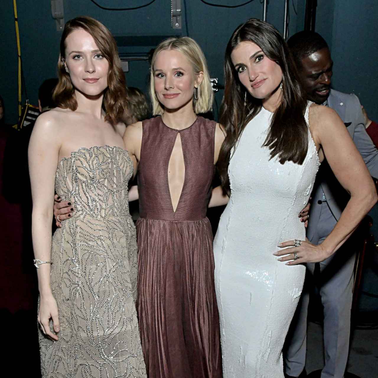 アナの声を担当した俳優のクリスティン・ベル(中央)とエルサの声を務めた俳優のイディナ・メンゼル(右)、アナ&エルサの母親の声を担当した俳優のエヴァン・レイチェル・ウッド(左)とスリーショット。