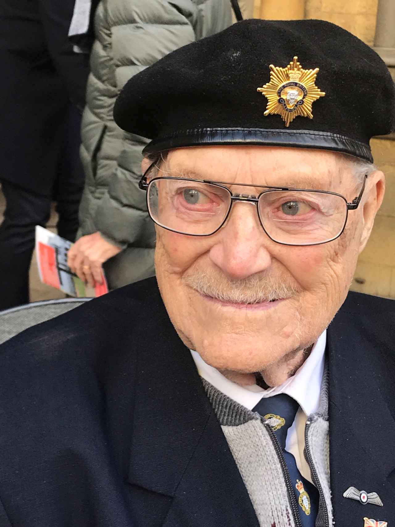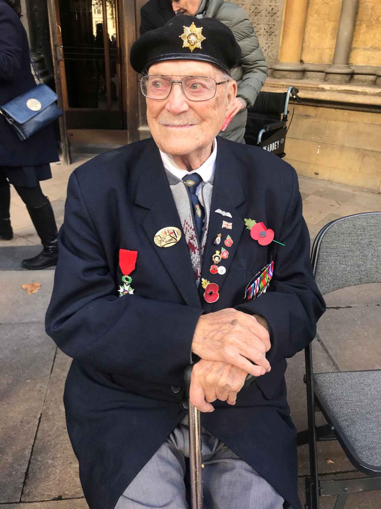この日、これまでに授かったたくさんの勲章と、戦没者への異例の意味をもつ赤いヒナゲシの花を象った「リメンブランス・ポピー」と呼ばれるブローチをつけたジャケットを着用していたアレン氏。
