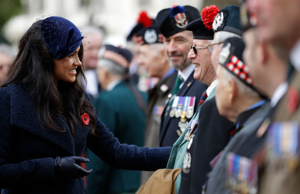 退役軍人や兵士らと交流するメーガン妃。