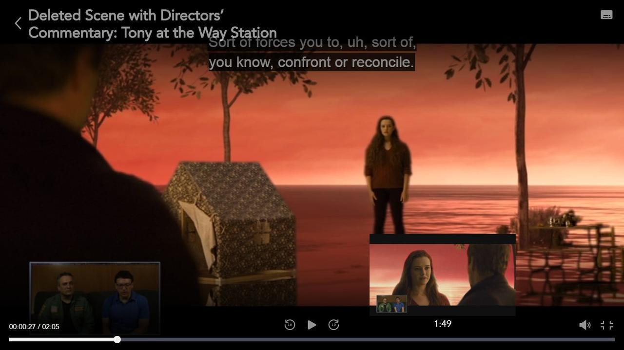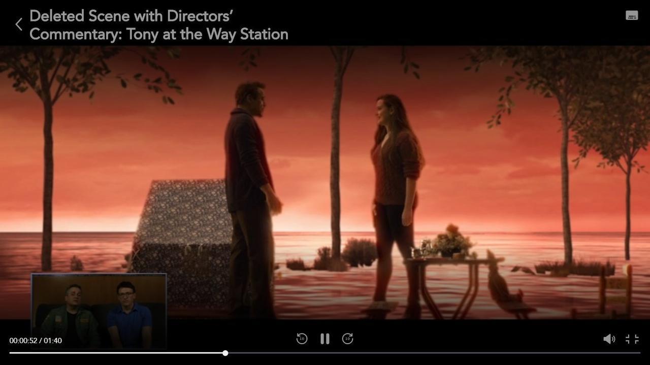 『アベンジャーズ/エンドゲーム』のジョー&アンソニー・ルッソ監督による解説つきの映像でロバートとキャサリンのシーンが映され、その一部ではキャサリン演じるモーガンが、「一緒にいられる時間があって私は幸せよ。あなたはそれができなくなるまで、わたしの側にいてくれた」とロバート演じるトニーに伝える場面がある。