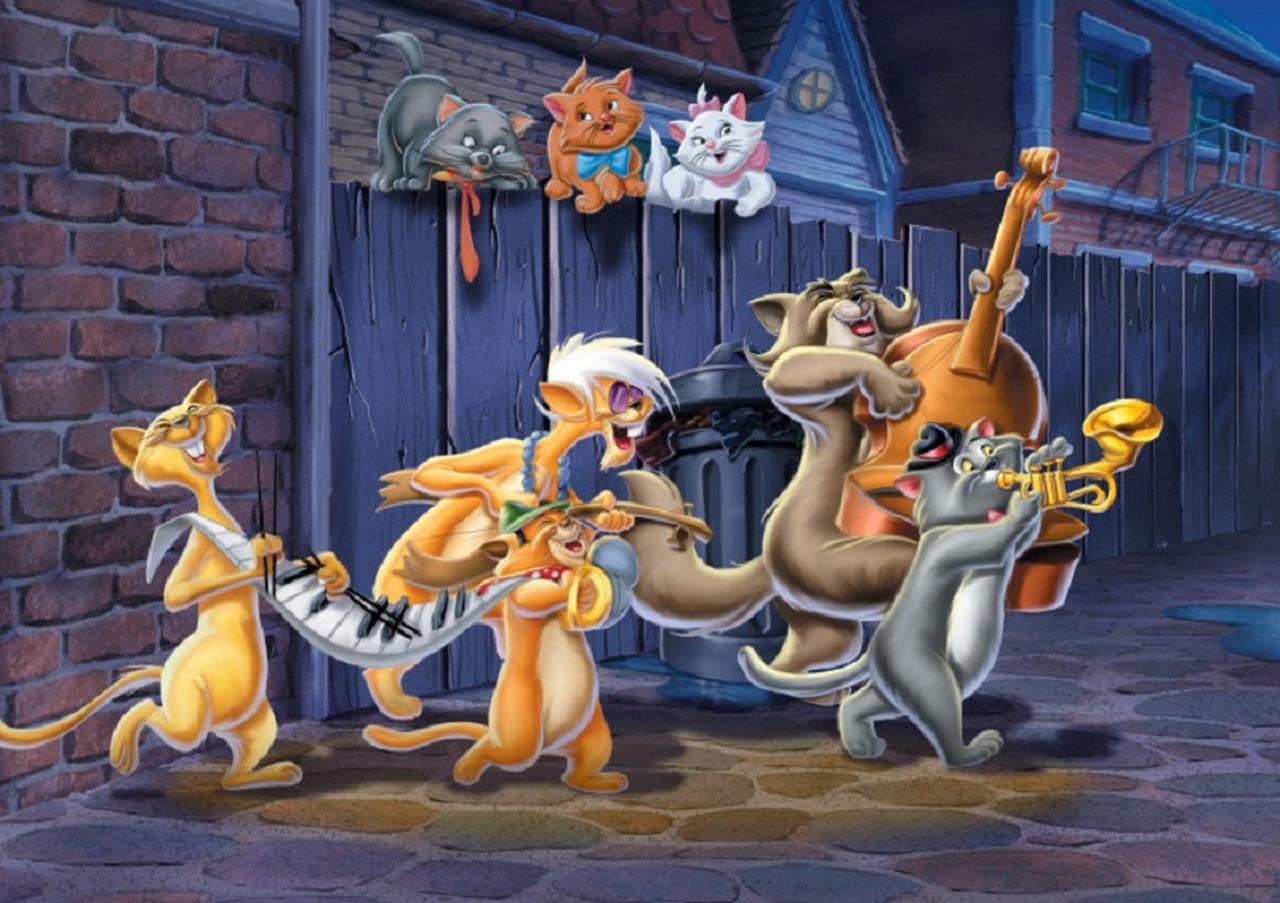 映画『おしゃれキャット』より。キーボードを首から下げる猫の両手には箸が一膳ずつ握られている。© DISNEY / Album/Newscom