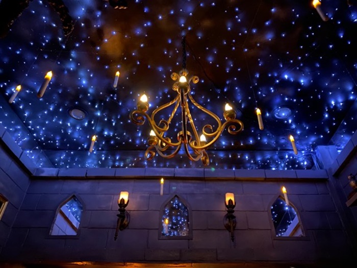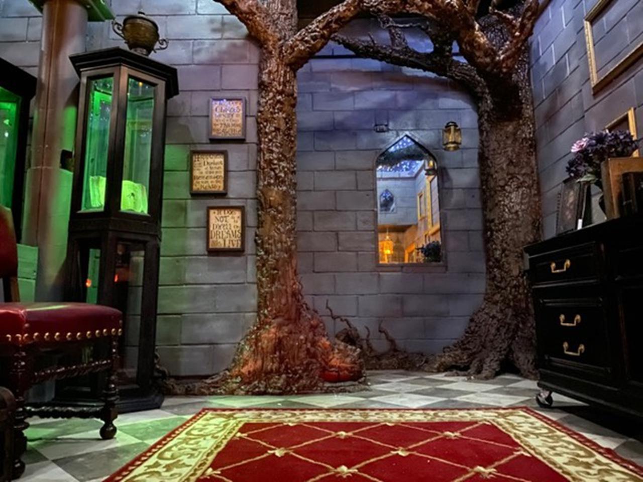 リノベーションで一番苦労したというのが、部屋の大部分を占める壁。ブライアンは発泡スチロールで年季の入ったレンガを1つずつ作り、それをすべて壁に装着して部屋全体をホグワーツのような古い建物の雰囲気に仕上げた。さらに、スプレーペイントを使って天井をリアルな夜空のように塗装し、天井から違う種類のライトとシャンデリアを垂らし、ホグワーツの大広間にある本物の空模様に見えるように魔法をかけられた天井を再現。これだけにはとどまらず、ブライアンはワイヤーを駆使して部屋の中に樹木を設置。部屋中に根っこが伸びる演出は、もはやさすがとしか言いようがない。