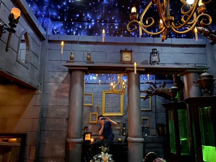 ホグワーツにありそうなアイテムは、ほとんどリサイクルショップで手に入れたというブライアン。レトロな赤いイスやカーペット、キャンドル立て、ゴールドの入れ物などは、なんと100件以上のリサイクルショップを回ってゲット。なかでもブライアンのお気に入りは、アート画像を飾った額に交ざった何も飾られていない額だといい、これは、立てかけてある額の肖像画が出かけてしまったような雰囲気をイメージして作ったそう。