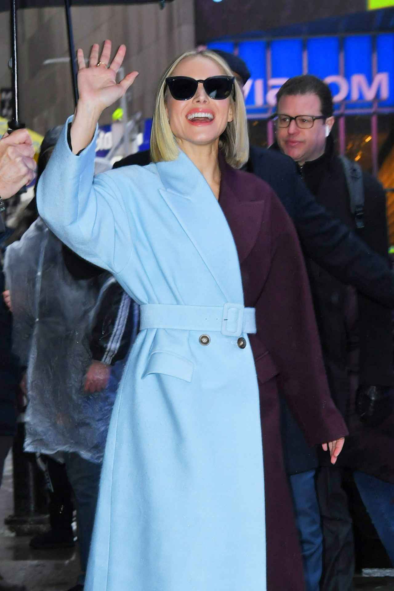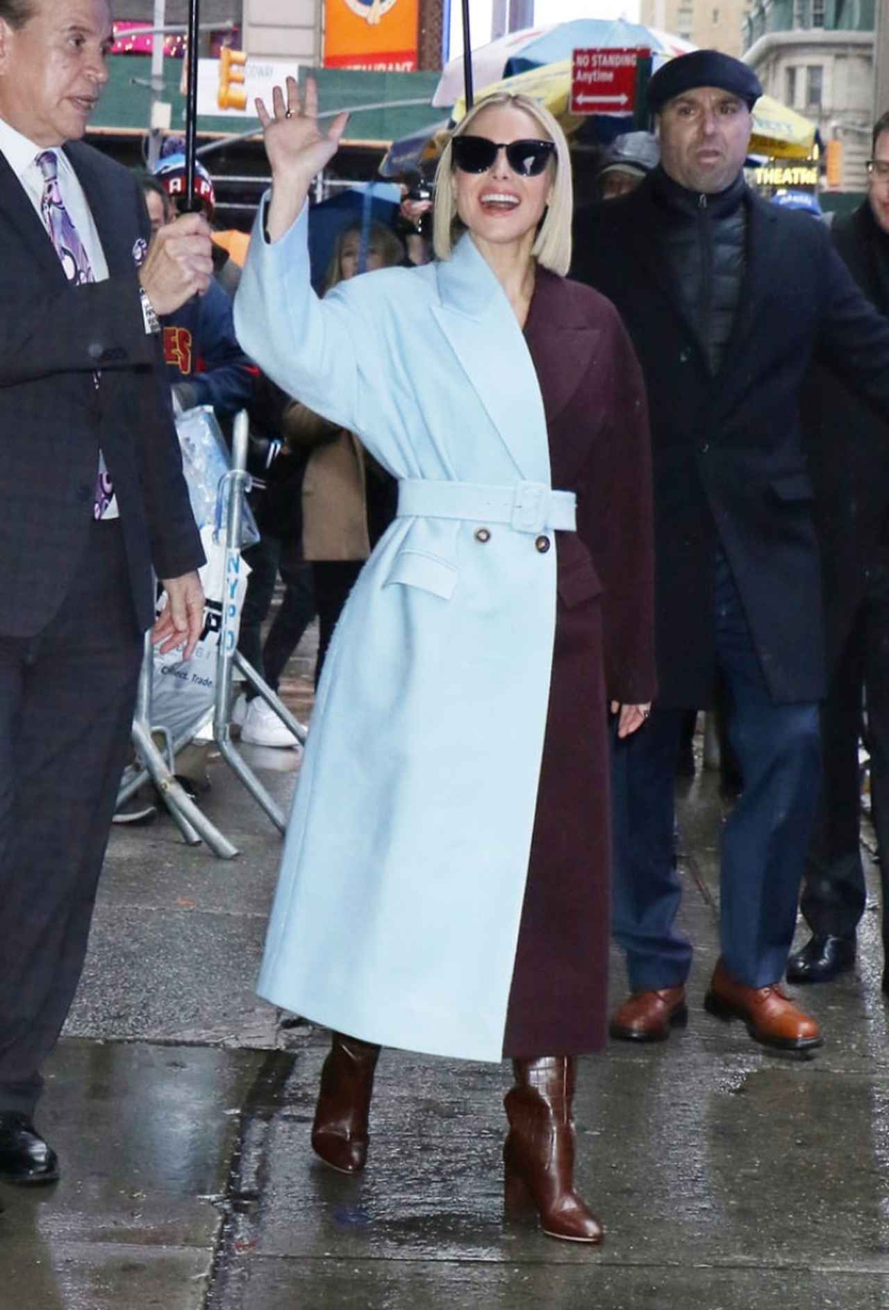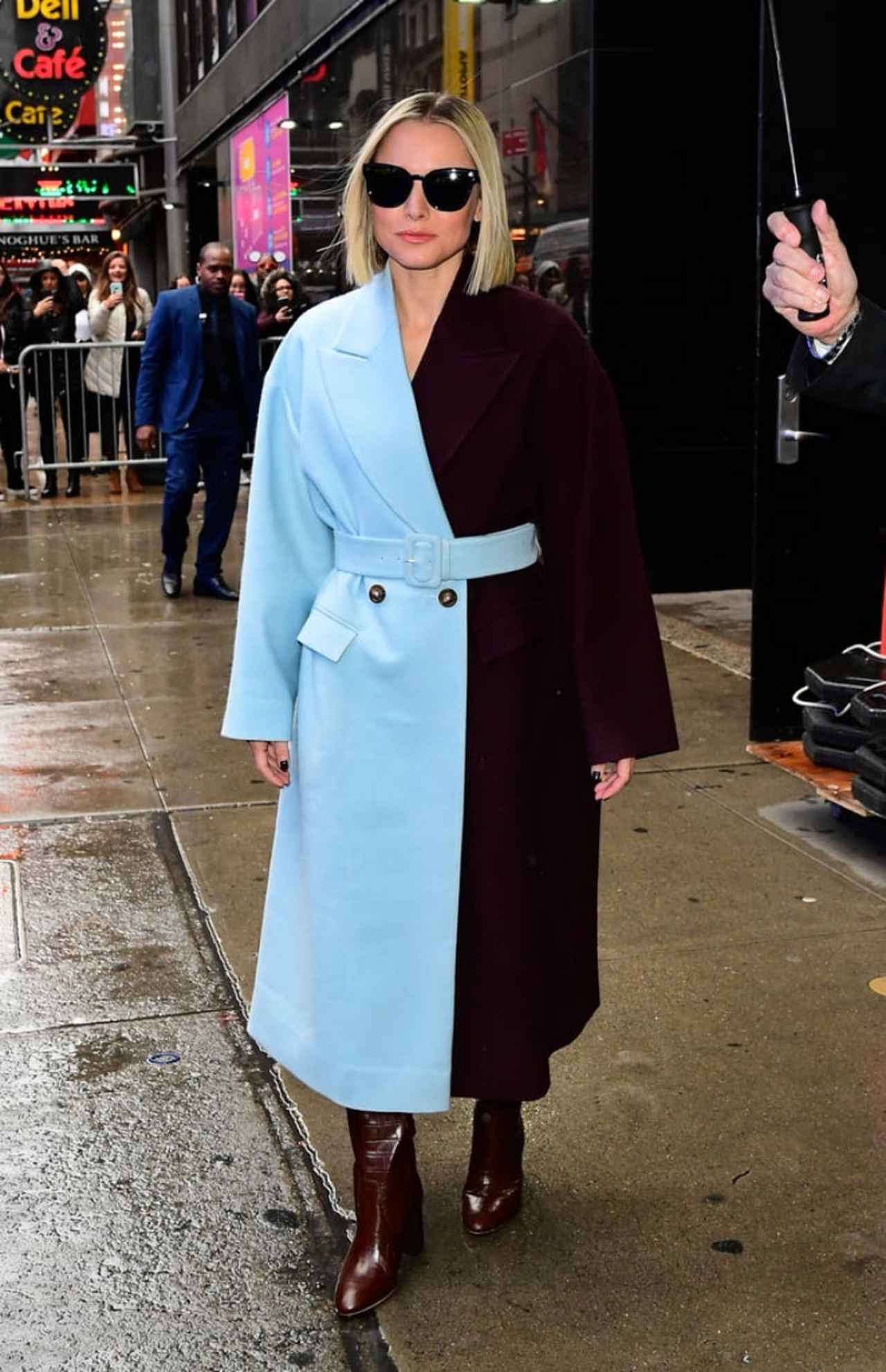 そんなクリスティンが、朝の情報番組への出演のために、ニューヨークの街に降臨した際に着用していたのが、左半分がパウダーブルー、右半分がディープパープルのユニークなデザインのカラーブロッキングコート。