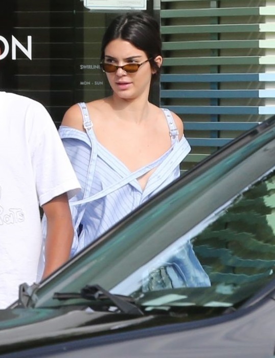 トップモデルのケンダル・ジェンナーは、アンブッシュのヒットアイテム、シャツがベースになったオフショルダートップスをプライベートで愛用。