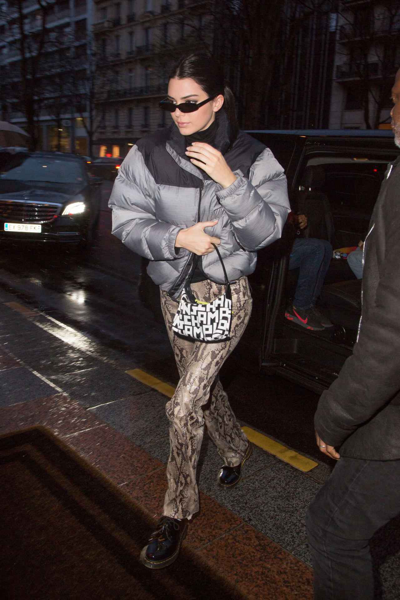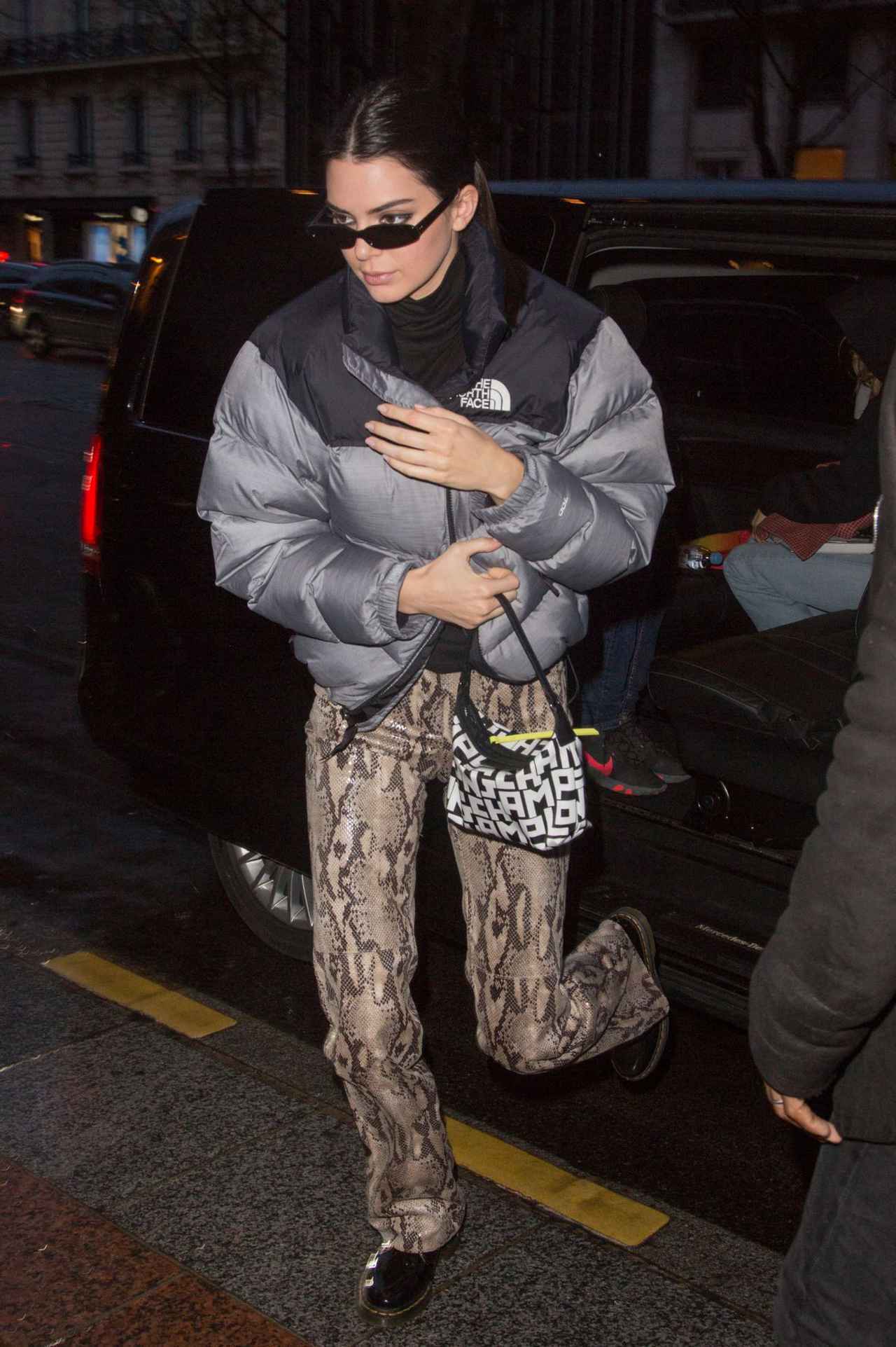 ケンダルが愛用するのは、ノースフェイスの中でも世界的に人気を博すモデル「1996 レトロ ヌプシ ダウン」。パリでディナーに向かったケンダルは、ノース・フェイスのグレーとブラックのバイカラーのダウンにスネークプリントのパンツを合わせた、モデルらしいスタイル。