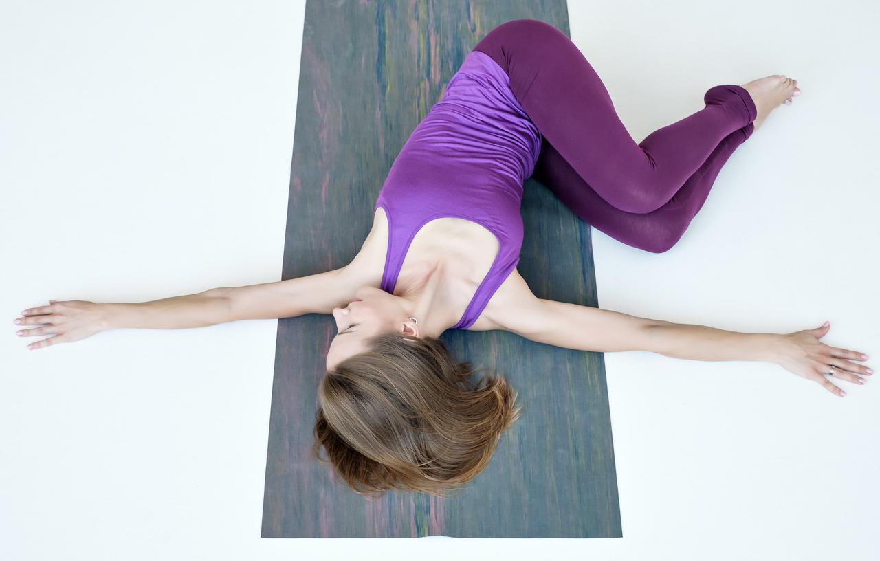 一度、下半身は中央に戻してSTEP1の状態に。続いて、今度は下半身をさきほどとは逆の左側に倒す。顔は天井、もしくは右手の方向に。深呼吸を5回以上行なう。終わったらSTEP1の形に戻る。
