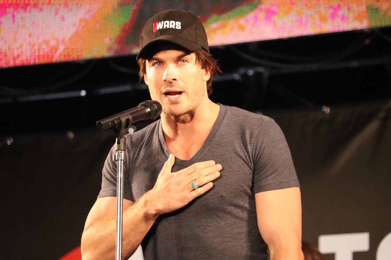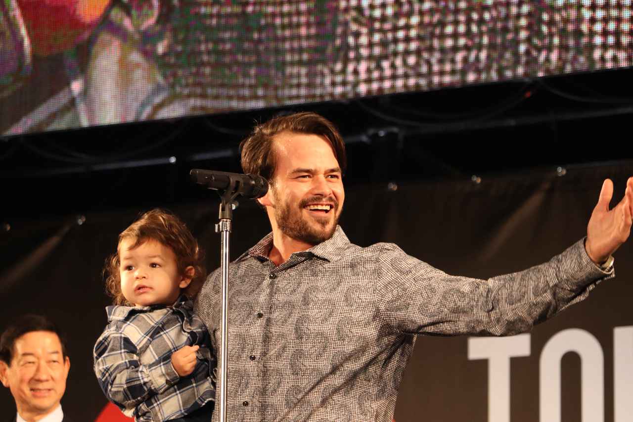 新作主演ドラマ『V War(原題)』の予告編が公開されたばかりのイアン・サマーホルダーも、ウォーターボトルを手に持ち華麗に登場。ダニエルは愛息子を抱っこしてステージに登場し会場を沸かせた。