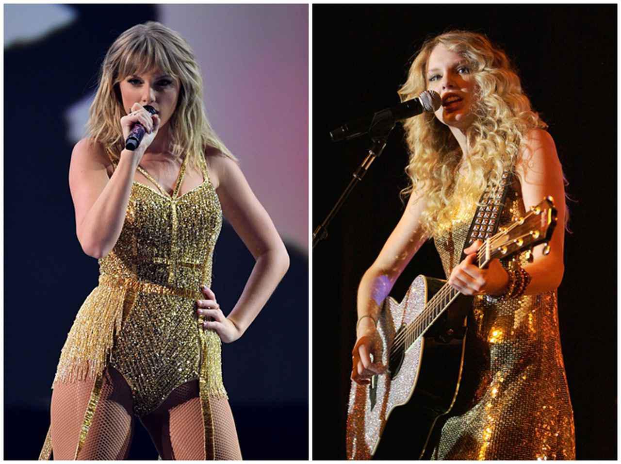 自身が制作した楽曲の所有権を訴えかけるシャツドレスの下には、光り輝くゴールドのドレスを着ていたテイラー。アルバム『Fearless』期を彷彿とさせる衣装でステージを彩った。