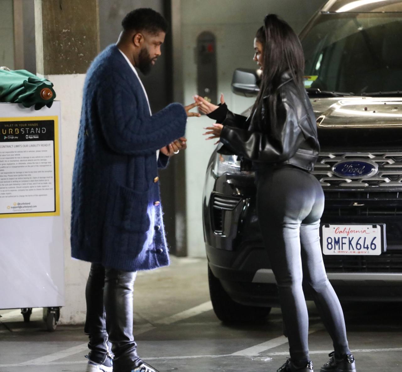 駐車場で友人男性となぜかジャンケンをして遊ぶカイリー。