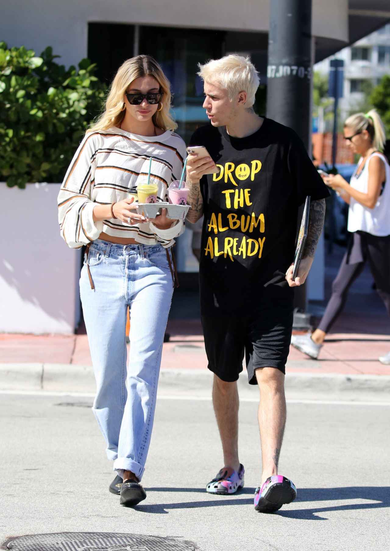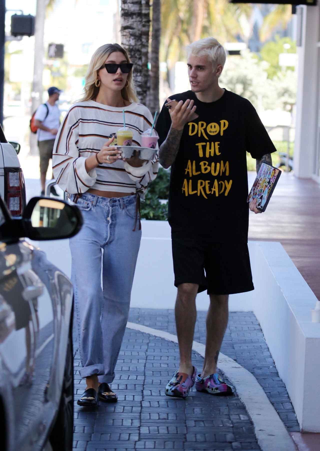 つい先日、ピンクへアに挑戦したと思ったら、すぐさまプラチナブロンドに変更するという気まぐれなファッションセンスを見せつけたジャスティンが、この日、ヘイリーとのお出かけの際に着用していたのは、「Drop the album already(いいかげん、早くアルバム出してよ)」というメッセージが書かれたTシャツ。