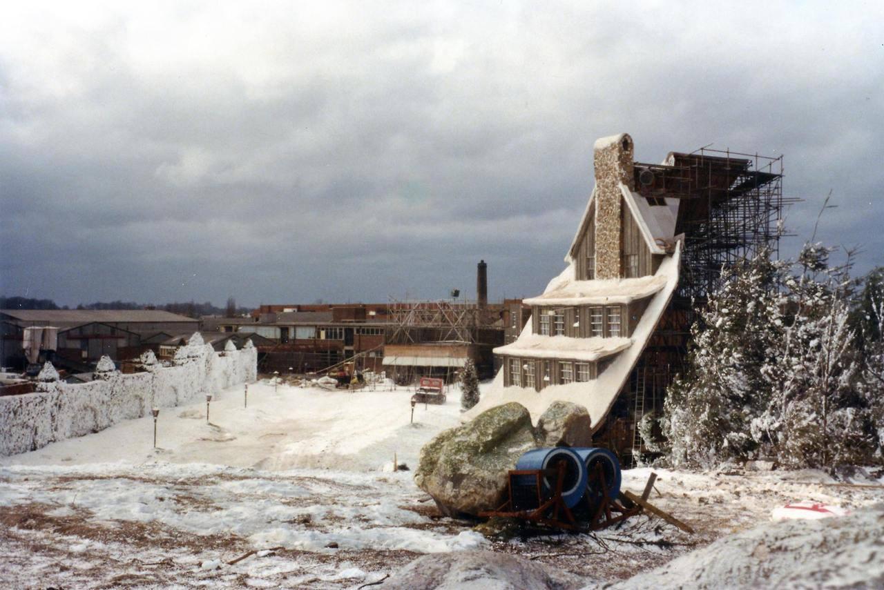 制作過程を見ると、その外観がなんと「ハリボテ」だったという衝撃の事実がわかる。ちなみに建物内もまた別のセットで作られ、撮影が行われた。