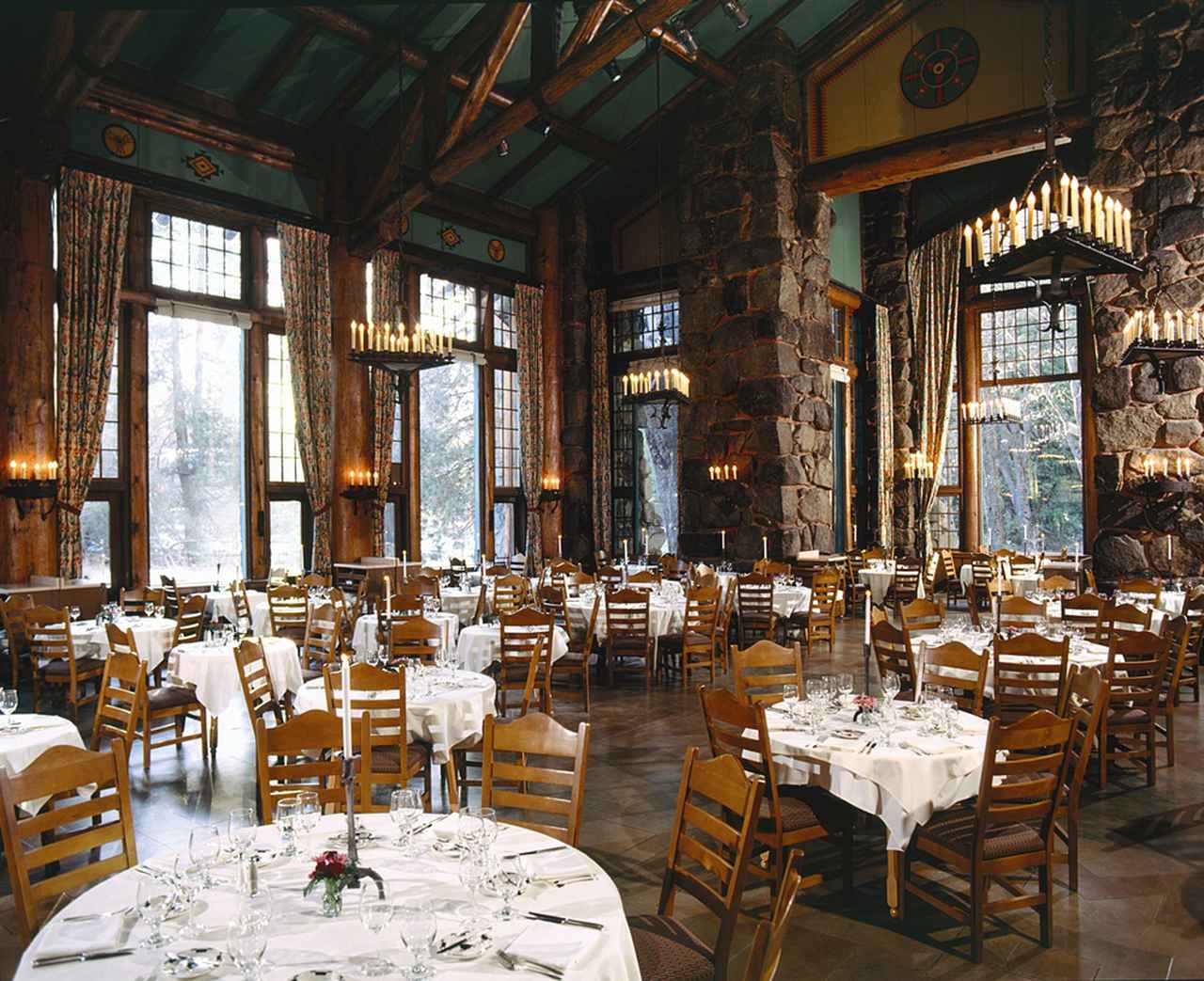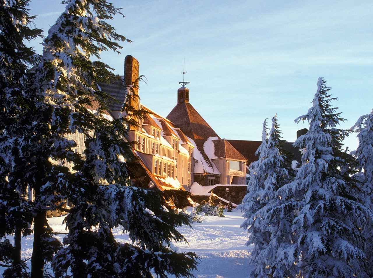 外観のモデルになったのは、アメリカのオレゴン州にあるフット山に建てられ、標高1,829mの深い森の中に位置している「ティンバーライン・ロッジ」。1937年に完成したこのロッジは、非常に重厚で歴史的な価値も高く、なんとあのルーズベルト大統領もテラスからスピーチした。
