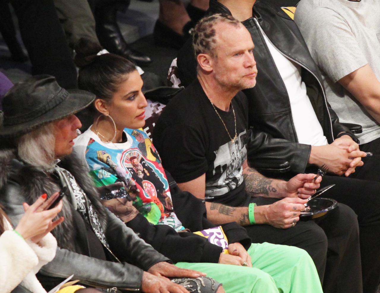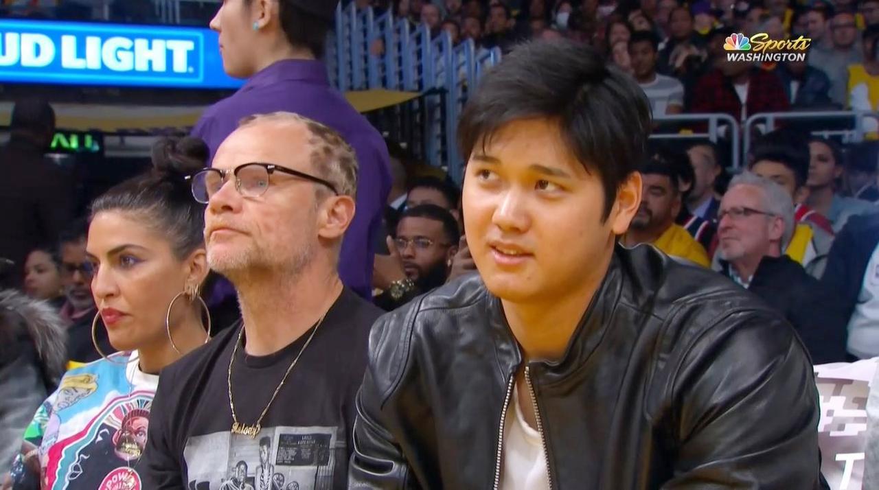 世界的ロックバンド、レッド・ホット・チリ・ペッパーズでベーシストを務めるフリーが、エンゼルスの大谷翔平と隣同士の席で、八村塁が出場したウィザーズ対レイカーズ戦を真剣な眼差しで観戦する様子を激写。(フロントロウ編集部)