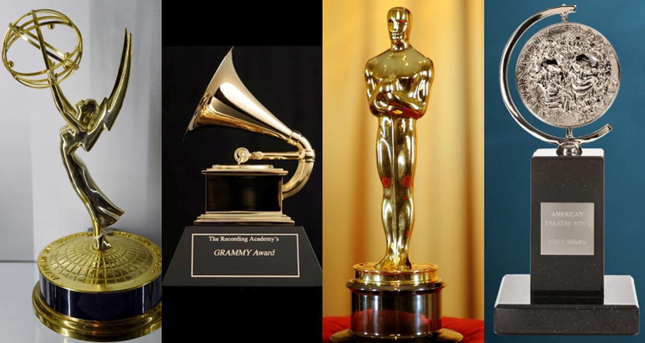 左から:エミー賞、グラミー賞、アカデミー賞、トニー賞のトロフィー