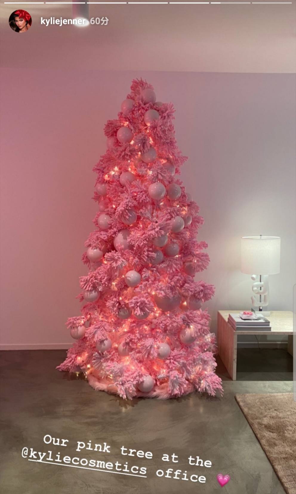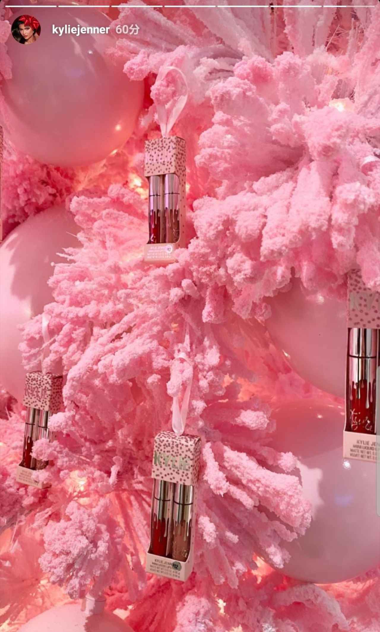カイリー・コスメティクスのオフィスに飾られたのは普通のツリーではなく、カイリーらしいキュートなピンク色のツリー。この段階では、球体のオーナメントしかつけられていなかったものの、あるアイテムが追加されたよう。それは、カイリー・コスメティクスで販売されているリップ。