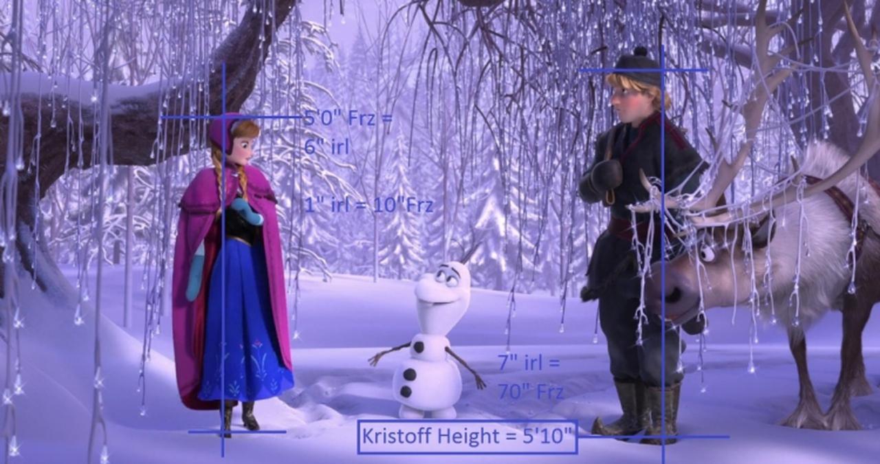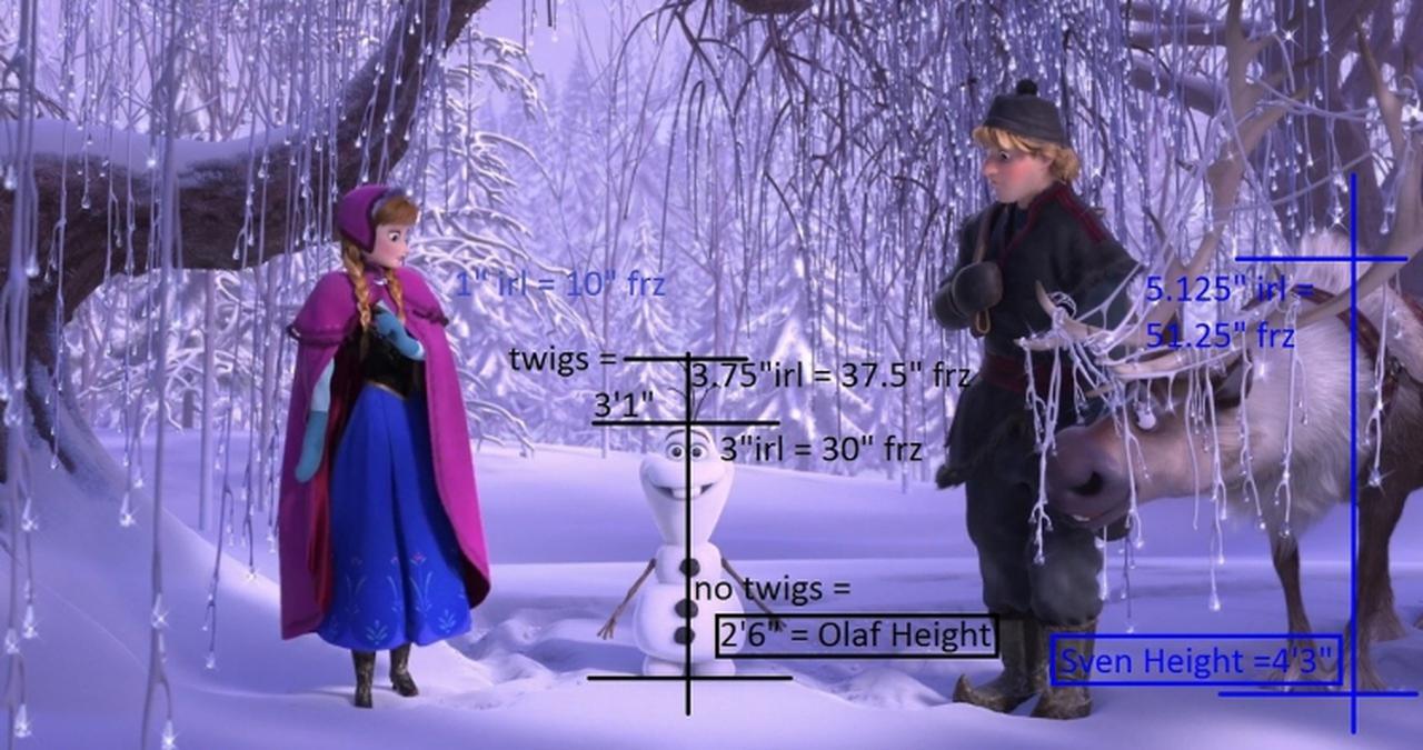 ちなみに、『アナと雪の女王』の公開後に、ある海外のファンが、劇中の映像から計測して理論的にはじき出した結果、アナは152㎝、クリストフは177㎝、それに対し、オラフは94㎝(頭の上の小枝の高さを含む/小枝なしでは76㎝)だと明かして注目を集めた。