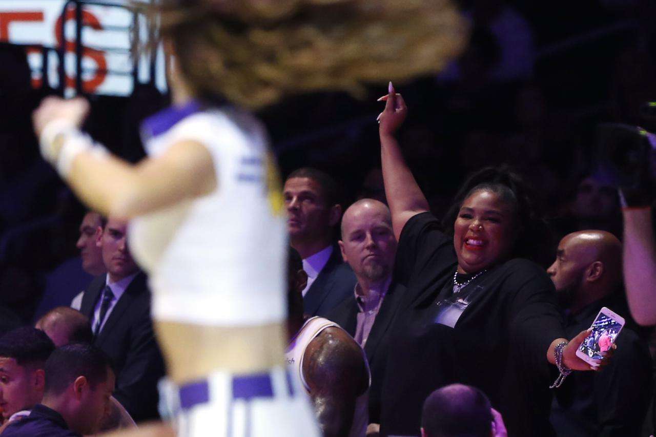 ロサンゼルス・レイカーズVSミネソタ・ティンバーウルブズの試合会場を訪れたリゾは、フロントロウで試合を観戦。ブラックのTシャツワンピに網タイツとショートブーツを着用したリゾは、レイカーズのチアリーダーたちが彼女の楽曲「ジュース」をパフォーマンスすると、立ち上がり躍り出した。