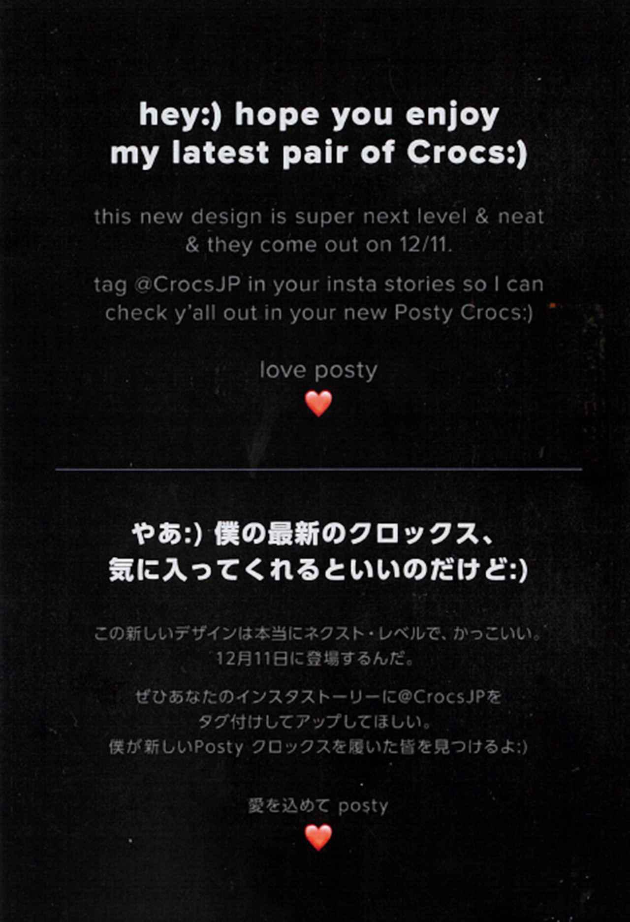 ポストとクロックスのコラボは、以前からポストがプライベートでクロックスを愛用していたことがきっかけで、2018年からスタート。過去に発売された商品はどれも販売開始からわずか数分で即完売し、あのマドンナが「欲しい」とクロックスに“おねだり”をしたのは有名な話。