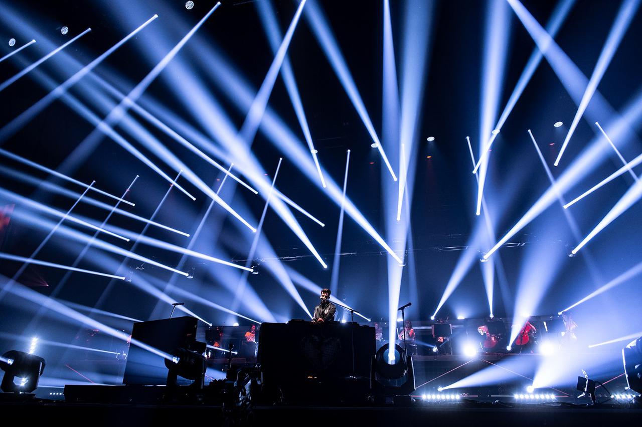 ストレートなDJセットだった前回に対して今年のセットは、DJとライブのミックス。マークにとって恐らく日本では初めてライブ演奏を交えた、ほかでは観られないスペシャルなショーであり、そのために彼が用意したのは12人編成のストリングス隊。まずはピアノに向かって、さる6月にリリースした最新アルバム『レイト・ナイト・フィーリングス』の導入部を弾き始めたマークは、「コンニチハ、ヨコハマ!」と呼び掛けると、豪奢なストリングスとピアノを添えて、シングル曲だったタイトルトラックを披露。ストリングスをふんだんに盛ったアルバムだっただけに、納得の演出と言える。