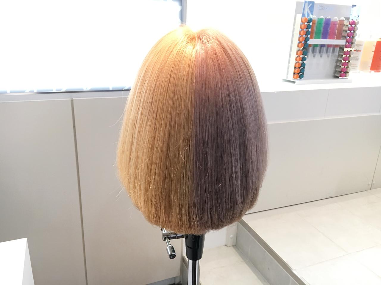 右半分:何も使用していない髪、左半分:ブロンド・アブソリュを使用した髪