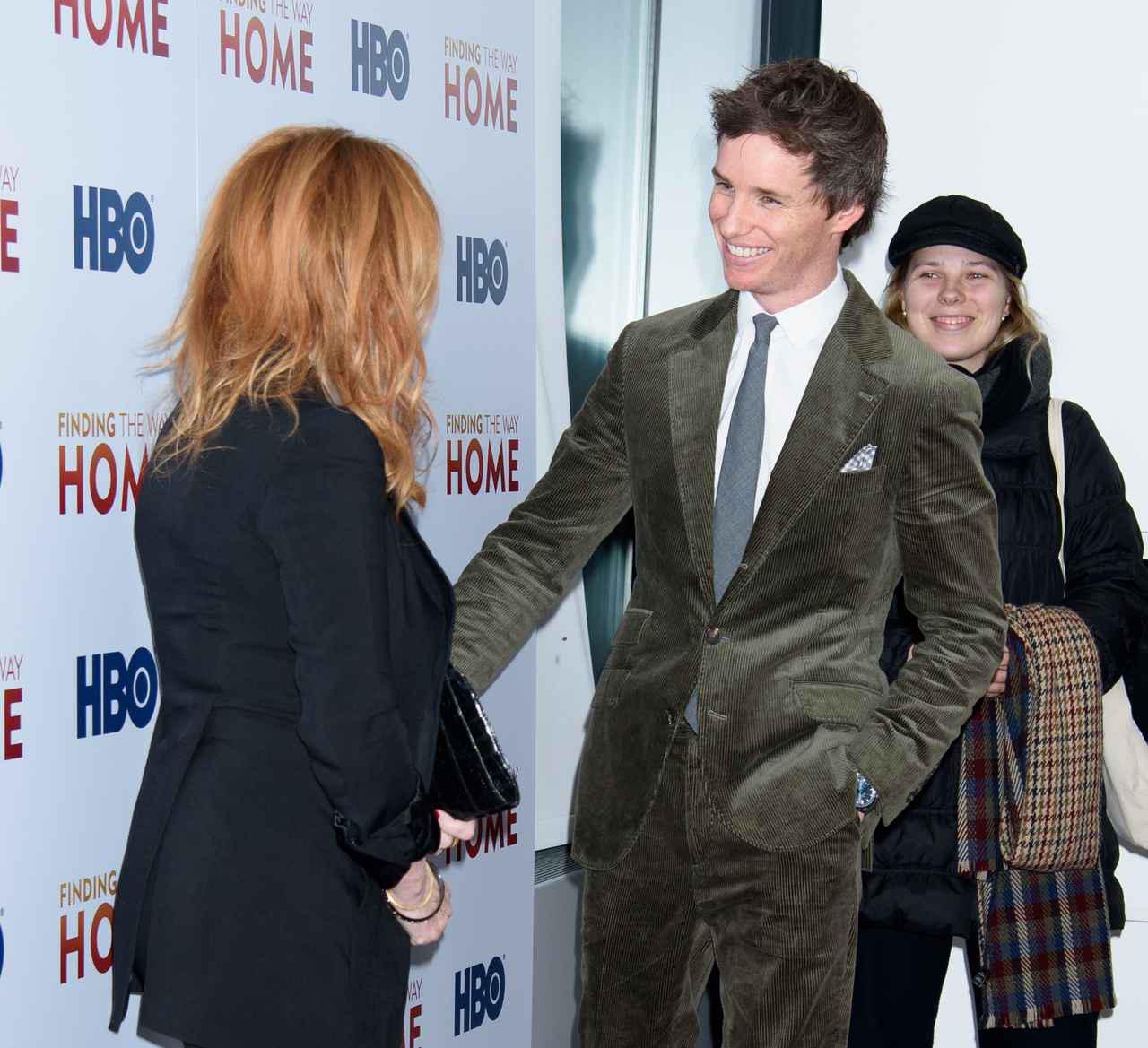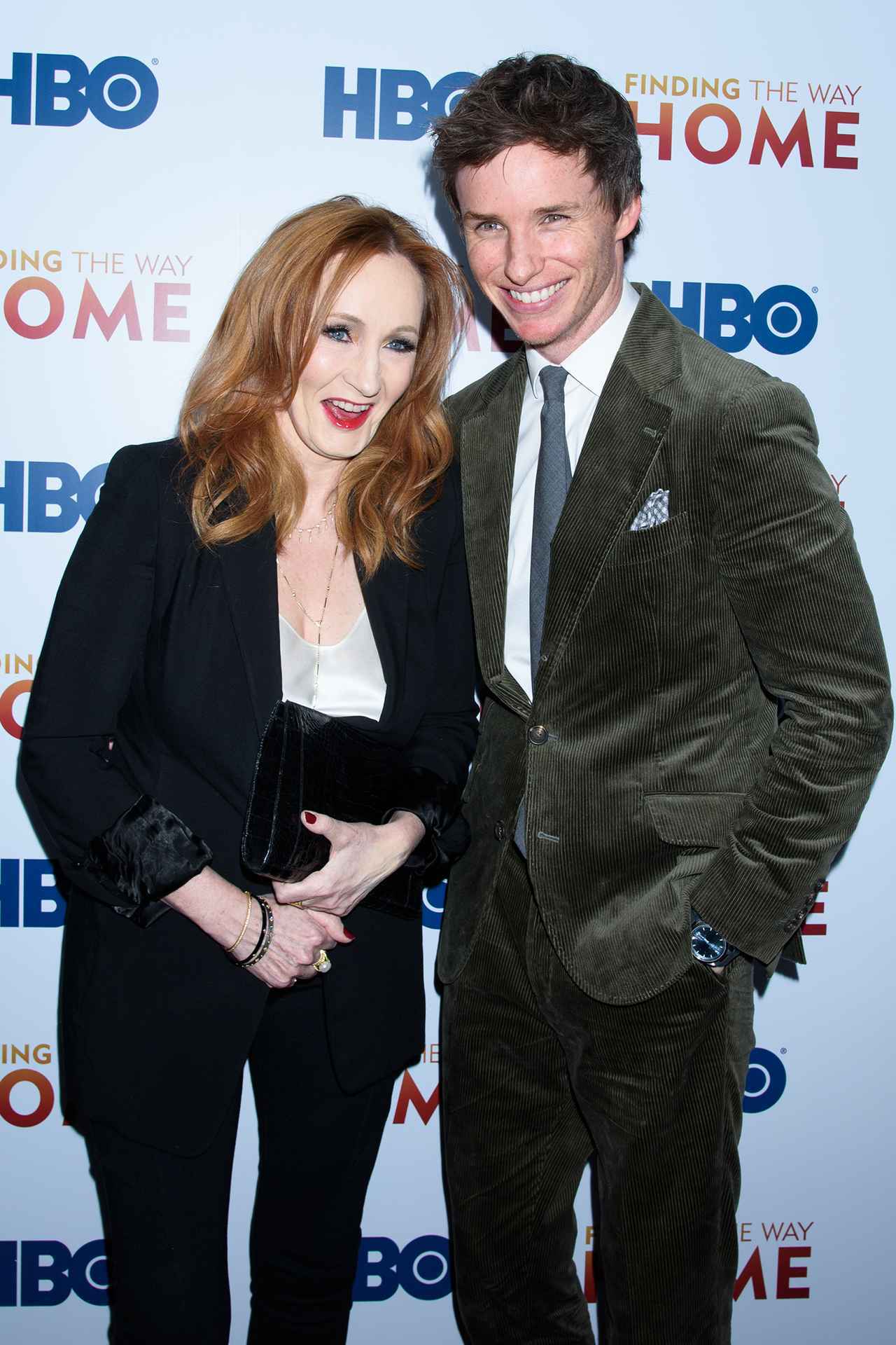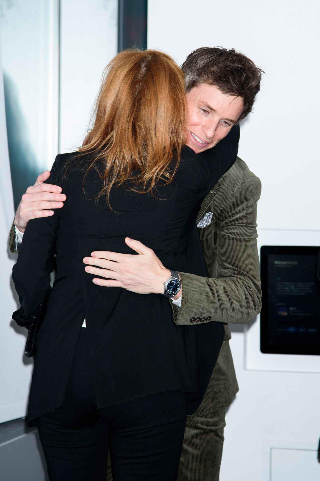 ホグワーツ魔法魔術学校の卒業生で、のちにハリー・ポッターが受ける授業で使う教科書を書くことになる魔法動物学者のニュートを演じるエディは、プレミア会場でJ.K.ローリングを見つけるとハグをして祝福。カメラの前では一緒に笑顔で写真を撮った。
