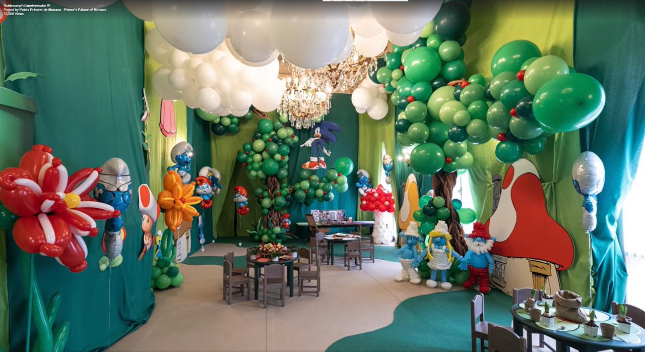 そんなジャック公子とガブリエラ公女は、クラスメイトを集めてモナコ大公が暮らすモナコ大公宮殿でバースデーパーティーを開催。5歳の誕生日会のテーマとなったのは、ベルギー生まれの人気キャラクターであるスマーフ。そのため、部屋にはスマーフの森がイメージされたデザインが施されており、バルーンで作られたスマーフたちの姿が。