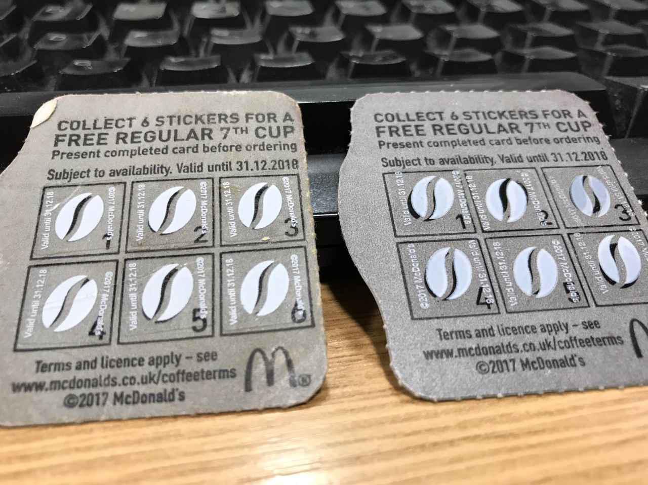 日本のマクドナルドでは、スムージーなどの商品を購入すると1ポイントが貰えるスタンプカードが期間限定で配布されたりするけれど、イギリスのマクドナルドでは、このコーヒーステッカーを6枚集めると1杯のコーヒーが無料になる。