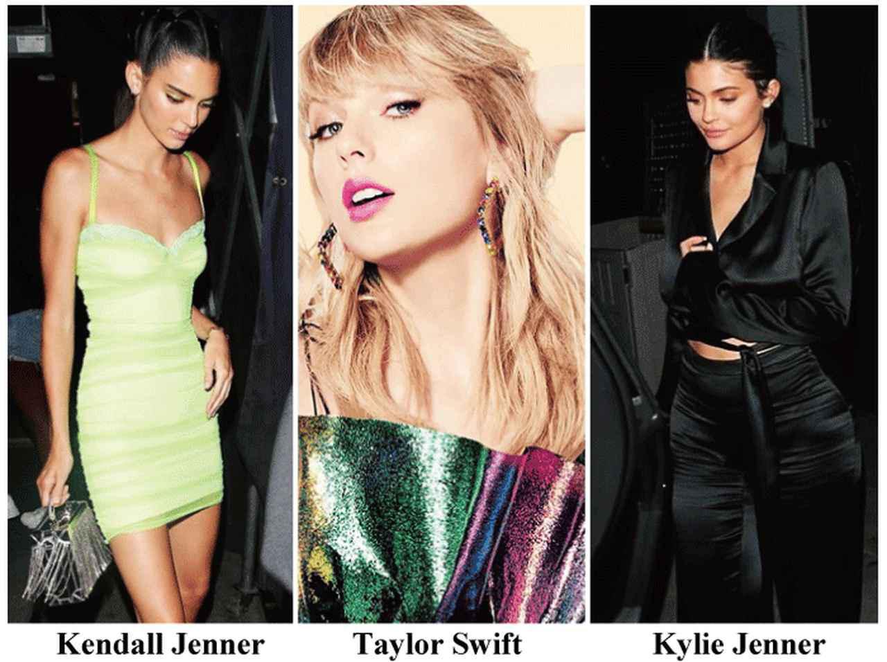エリアのバッグを愛用するトップモデルのケンダル・ジェンナー、ピアスを愛用するテイラー・スウィフト、トップス&パンツを愛用するカイリー・ジェンナー。