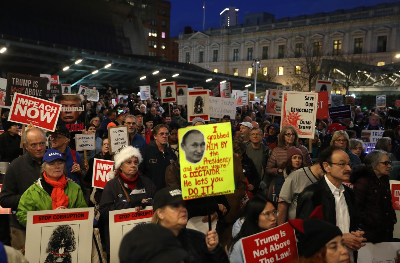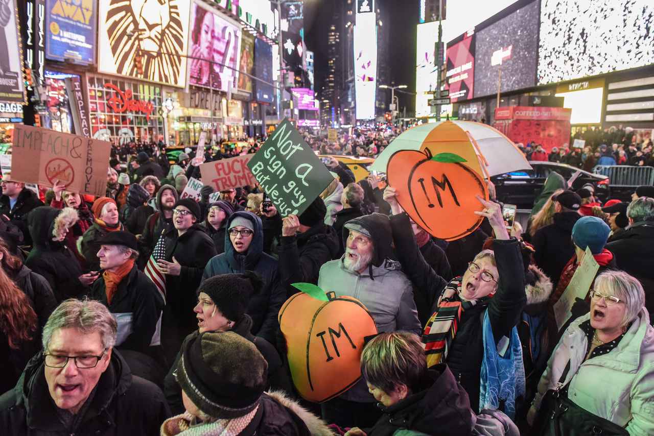 下院での弾劾審議の前夜には、全米でトランプ大統領の弾劾を求める集会が行なわれた。NYタイムズスクエア。