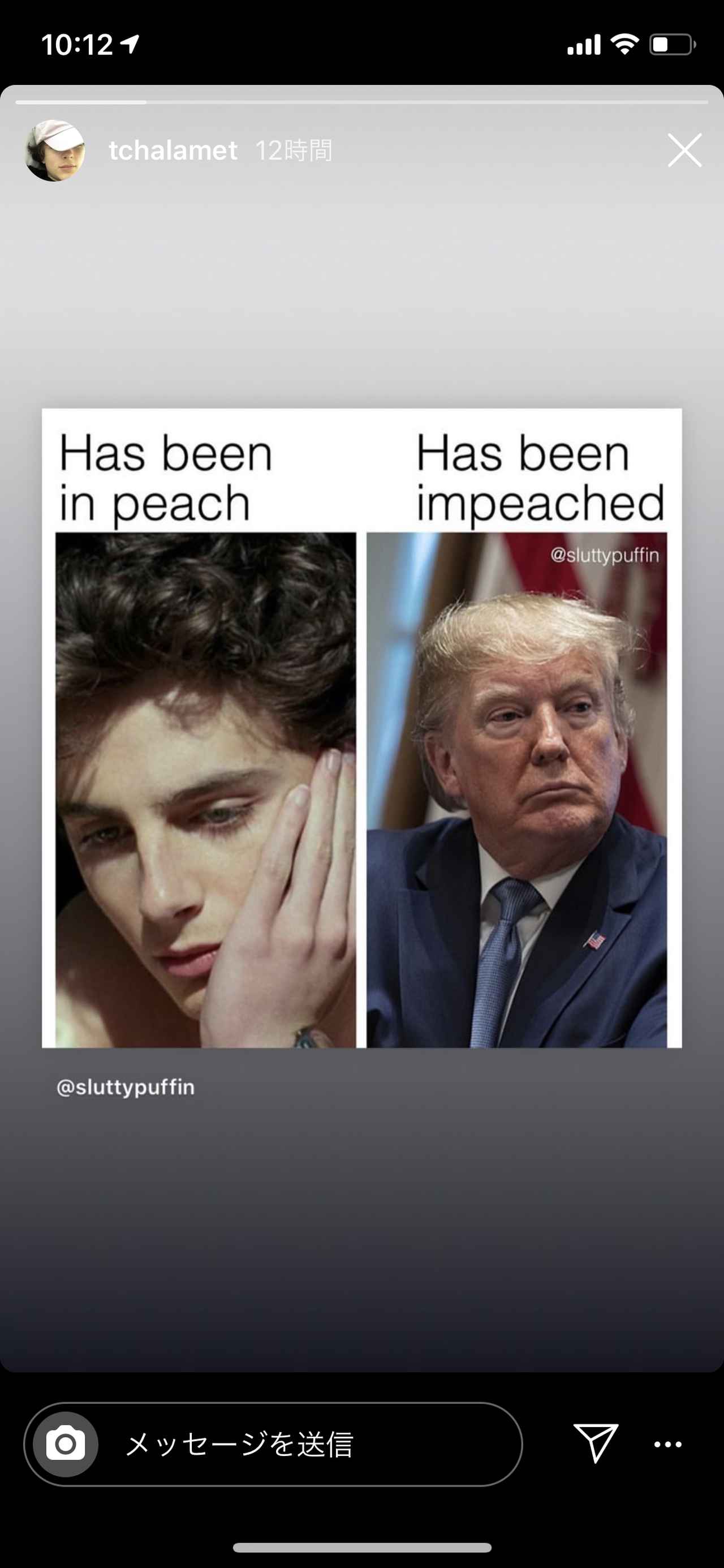 主演映画『君の名前で呼んで』の劇中で桃(ピーチ)を使って性行為をしたシーンがあるティモシーは、自分は「インピーチ(桃の中)に入ったことがある」、トランプ大統領は「インピーチ(弾劾)されたことがある」という言葉遊びをする写真をインスタグラム・ストーリーズに公開した。