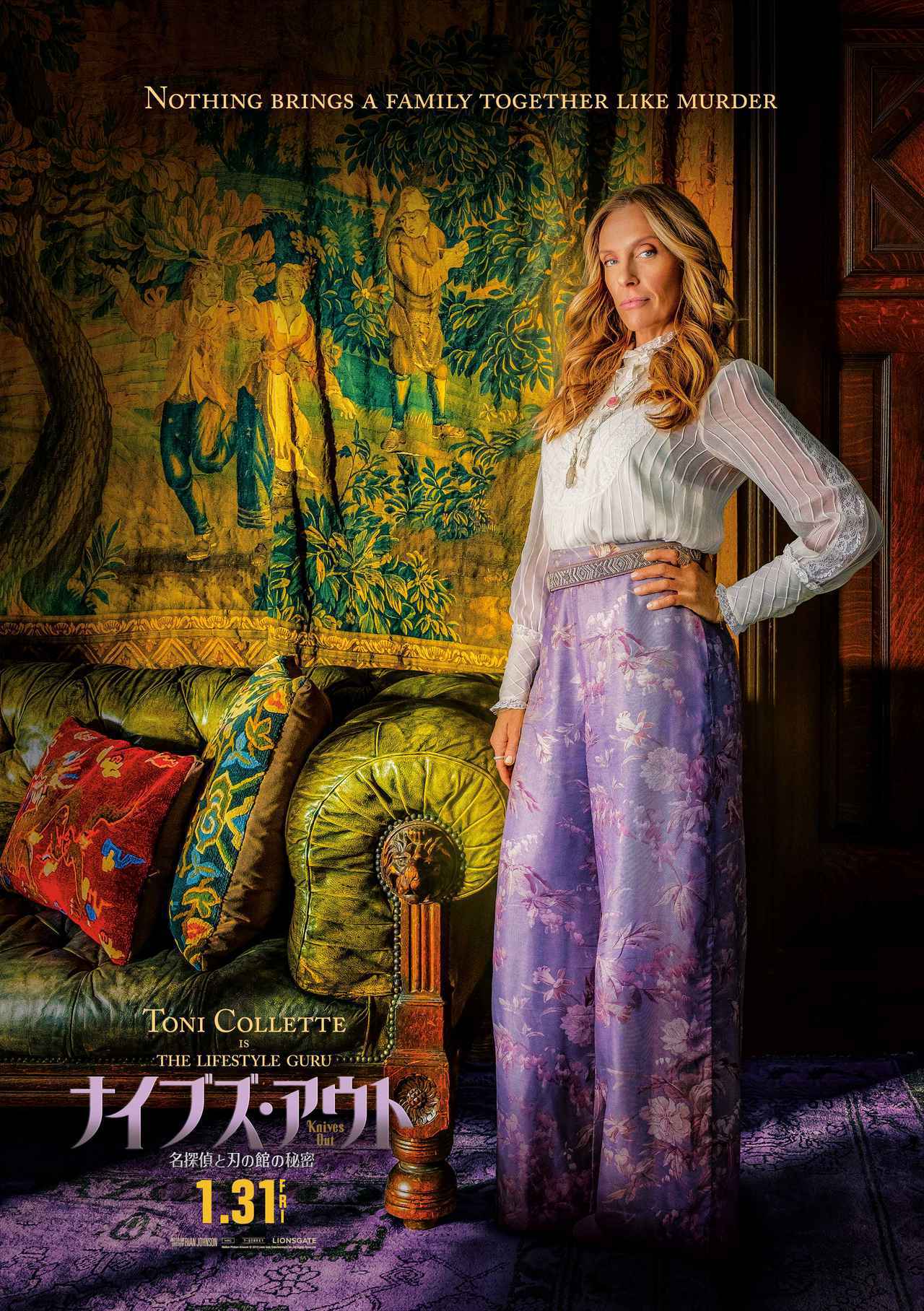 絵があしらわれたオリエンタルな織物の前でポーズを決めるのは、トニ・コレットが演じる義理の娘ジョニ。