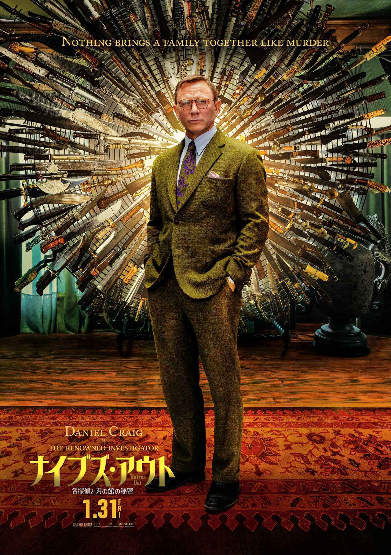 遺産をめぐり争うハーラン家の謎を解き明かす名探偵ブノワ・ブランを演じるダニエル。ポスターの背景には、映画のタイトルにもなっている“ナイフ”が大量に。