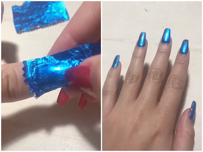 動画のなかで、まずジーニーはガムを取り除き、青い包装紙をくしゃくしゃっと丸め、再び広げて包装紙の内側にある薄紙を剥がした。次に、包装紙を爪の上に置き、反対の手の爪で表面をこすって包装紙を爪に密着させる。あとは、爪から余った包装紙を取り除いてメタリックネイルの完成!
