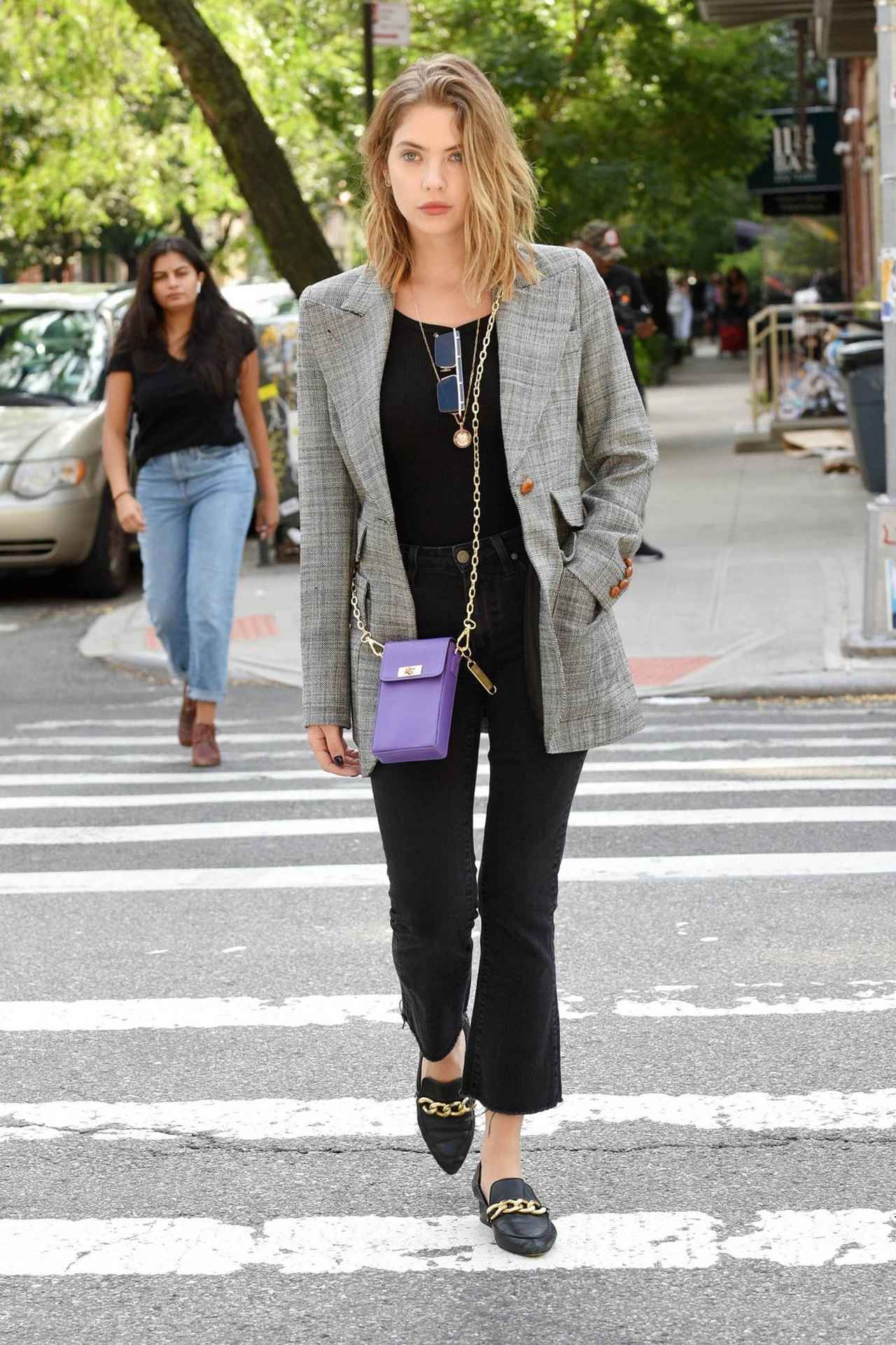 人気女優のアシュレイ・ティスデイルは、マニッシュなグレーのジャケットのインナーに、ハイウエストデニム+黒トップスでⅠラインを作り、縦のラインを強調して高身長に見せるテクを使って。