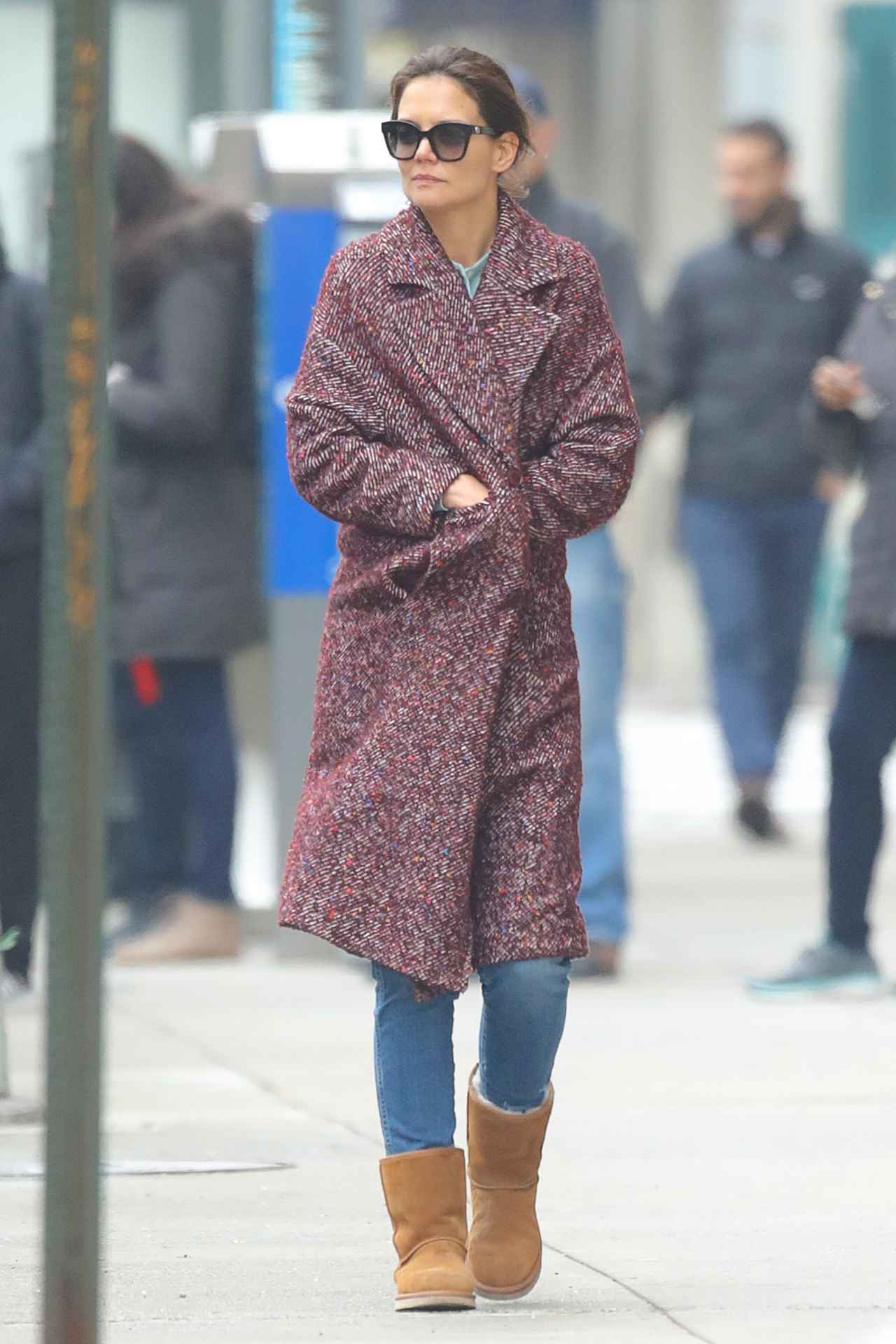 スキニーデニムと好相性なアグのブーツで、極寒のニューヨークを歩く姿をキャッチされた、女優のケイティ・ホームズ。デニムにボルドーカラーのツイードコートを羽織り、足元にはアグのクラシックブーツでアクセントを入れて。