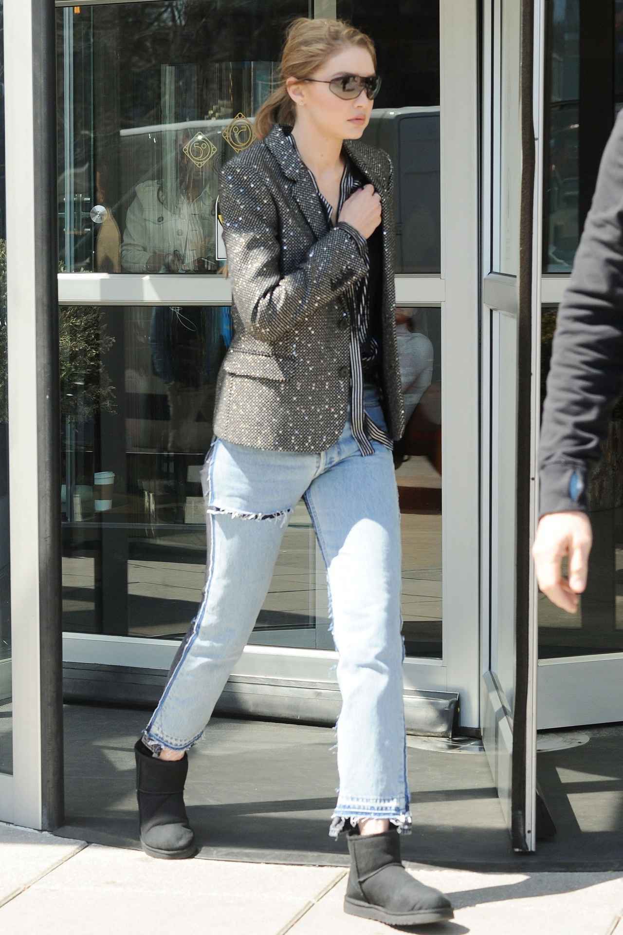 人気モデルのジジ・ハディッドは、Isabel Marant(イザベル マラン)のブレザージャケットにダメージデニムを合わせたマニッシュスタイルの足元に、アグのクラシックブーツを合わせてほどよく着崩して。