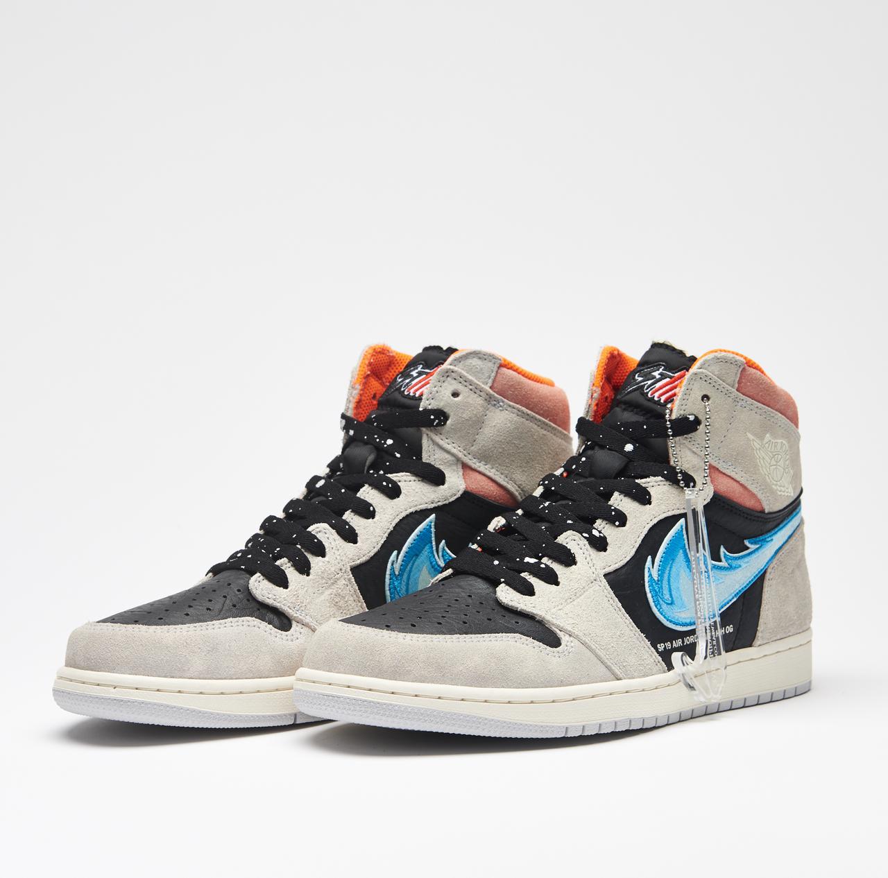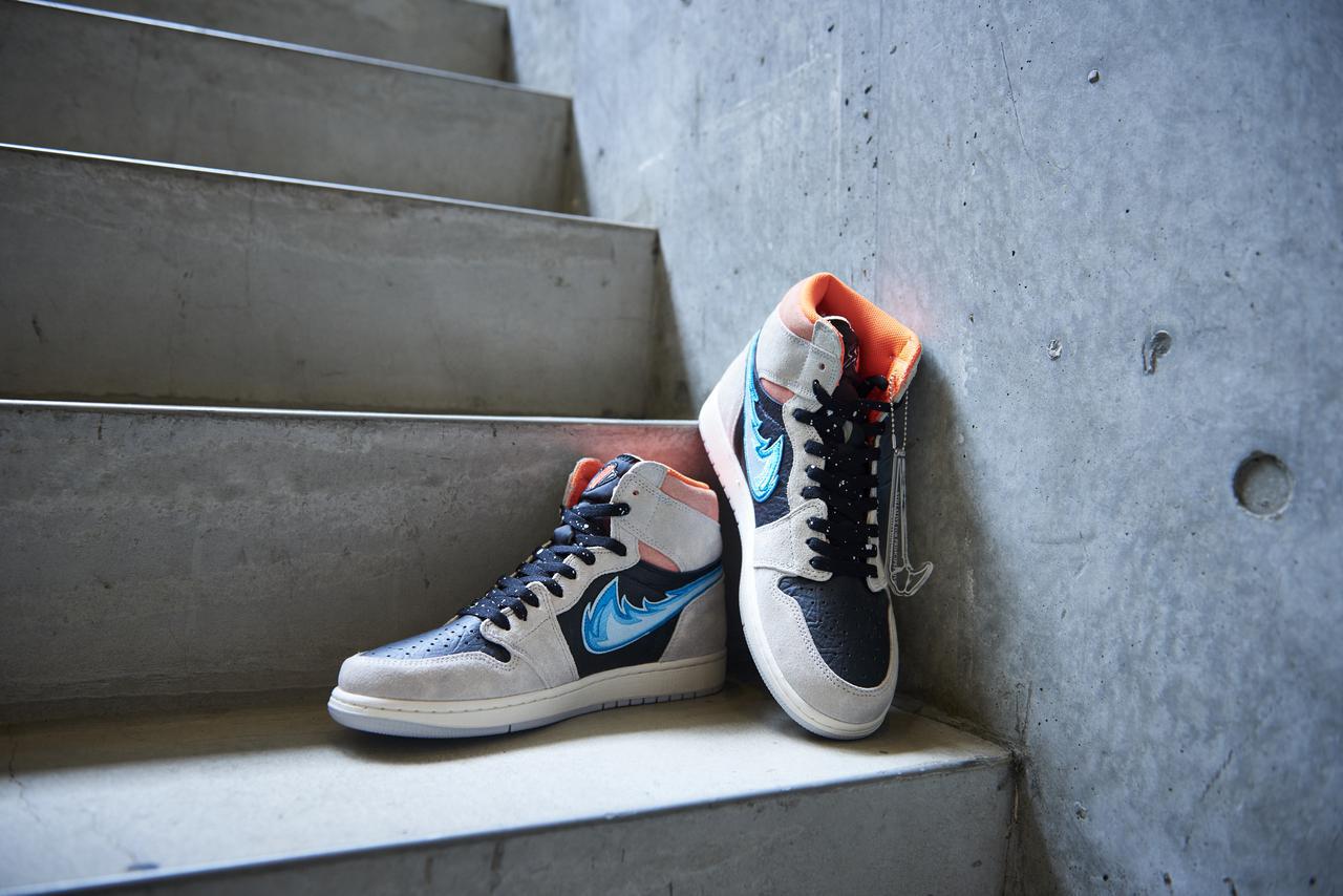 ナイキ エア ジョーダン 1 レトロ ハイ OG ナチュラル グレーをベースにリメイクしたDRAGON BREATH ICE AJ1 HIGH NEUTRAL GREYは、スティル アライブのオリジナルブルーを基調としたファイヤーパターンのスウォッシュを組み込んだ一足。