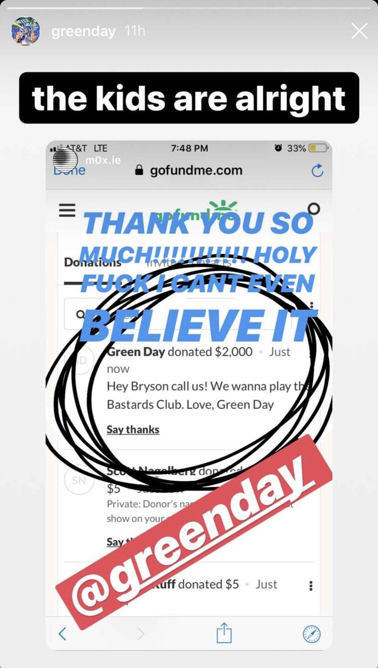 そんななか、なんとこの話を聞いたグリーン・デイが直接約22万円を寄付。大物バンドが資金集めに突然協力したことでも十分驚きだが、さらにグリーン・デイはブライアンにメッセージ。