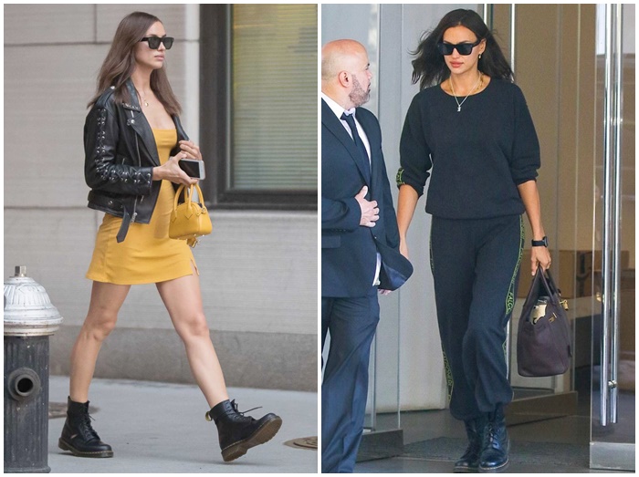 大御所モデルのイリーナ・シェイクは、鮮やかなワンピースにレザージャケットを羽織り、足元はマーチンのブーツでクールに仕上げて。