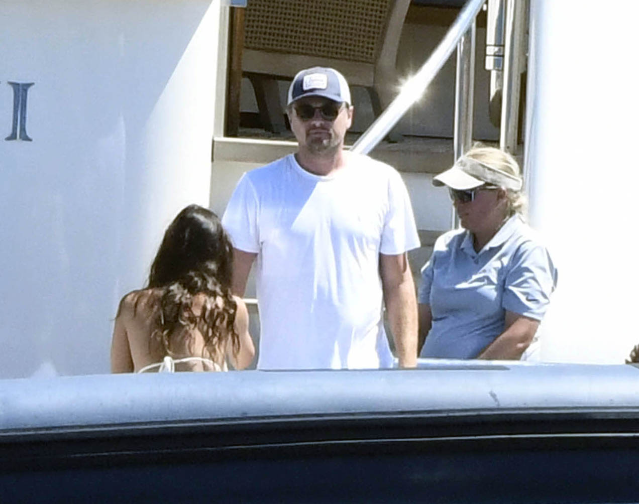 ※2019年8月に撮影された写真。恋人のカミラ(左)と一緒にクルージングを楽しむレオナルド。